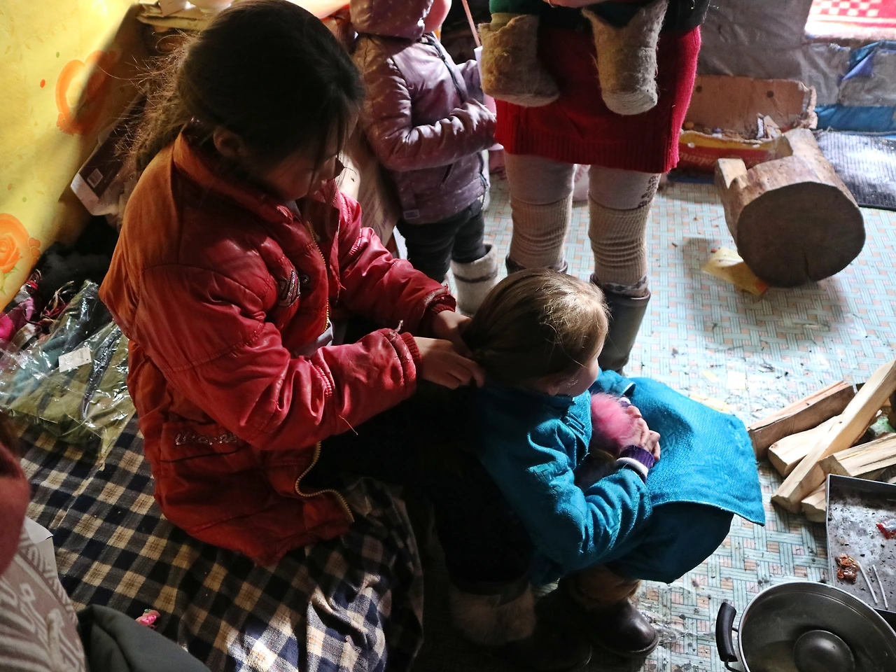 진료를 다 보고 강바 이장님 집에서 할머니를 기다리며 동생 머리를 따주는 언니.