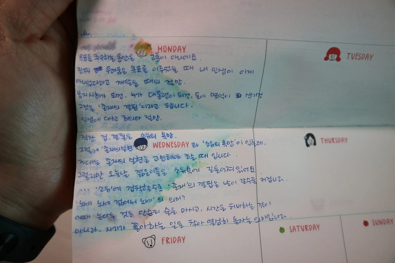 칸칸마다 꽉 채운 글씨들을 보면 참 만족스럽다. 이건 분명 ISTJ인 내 성향이 큰 몫을 하는 것 같다. ㅋㅋㅋㅋㅋ