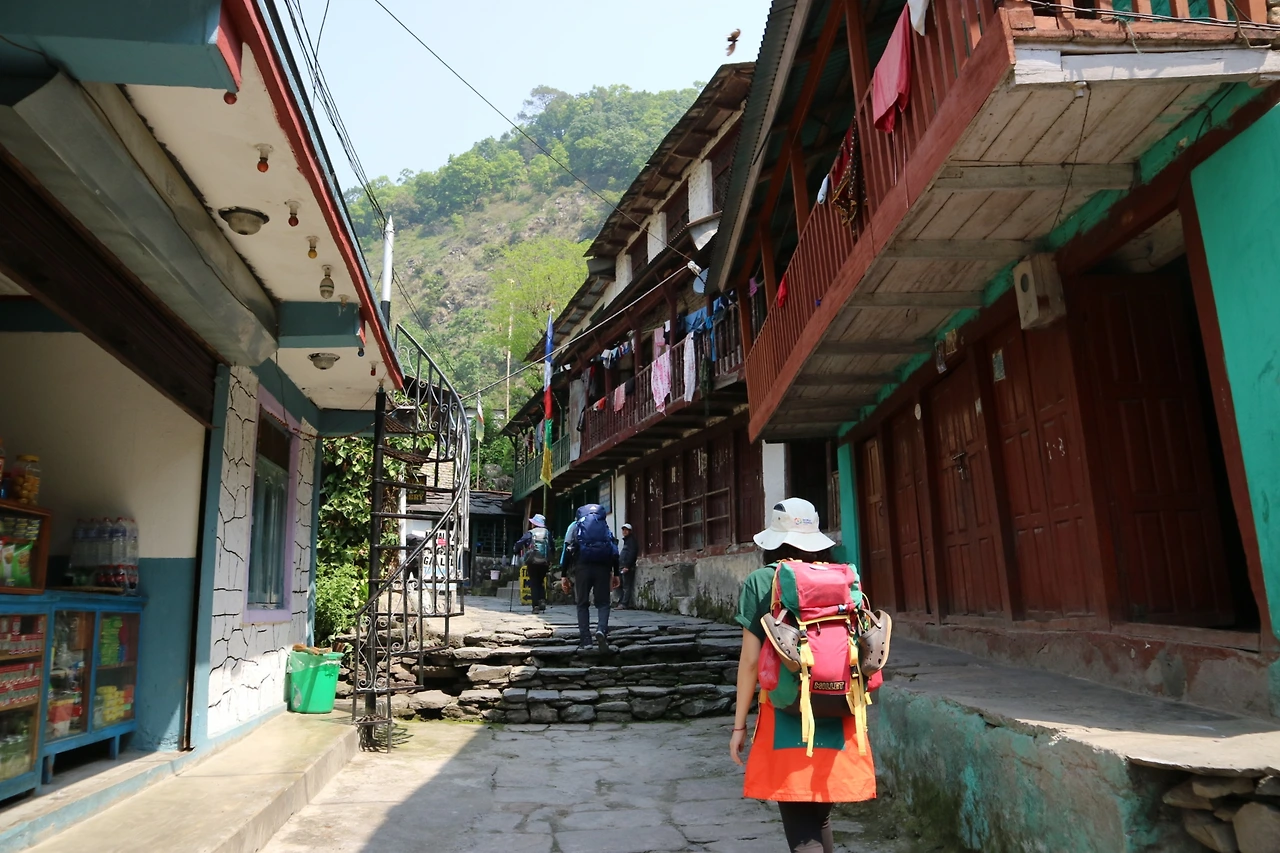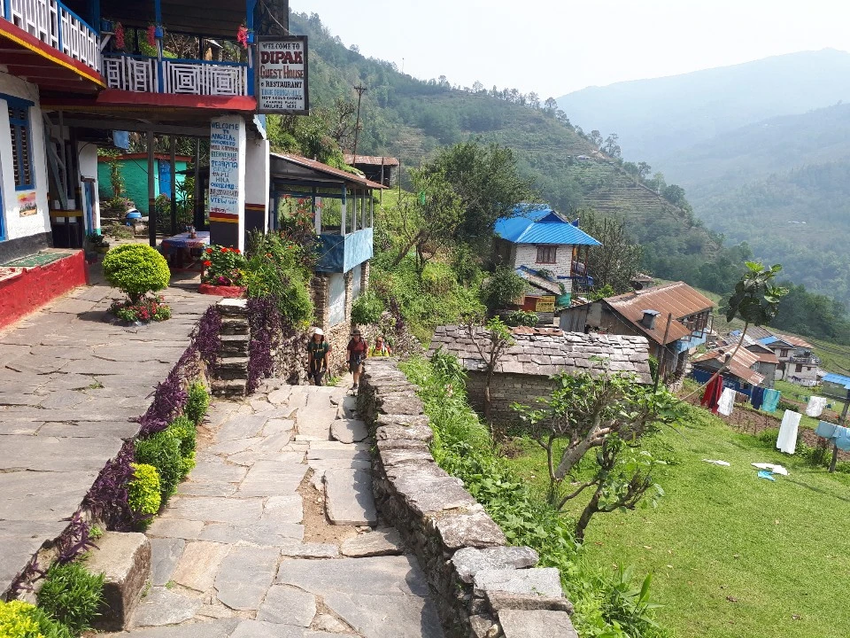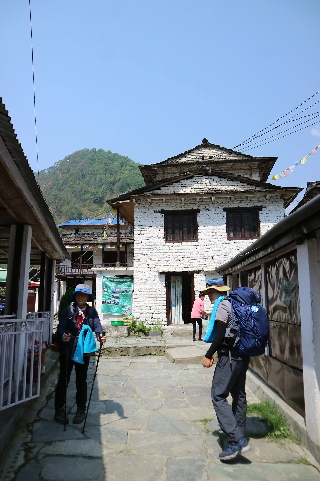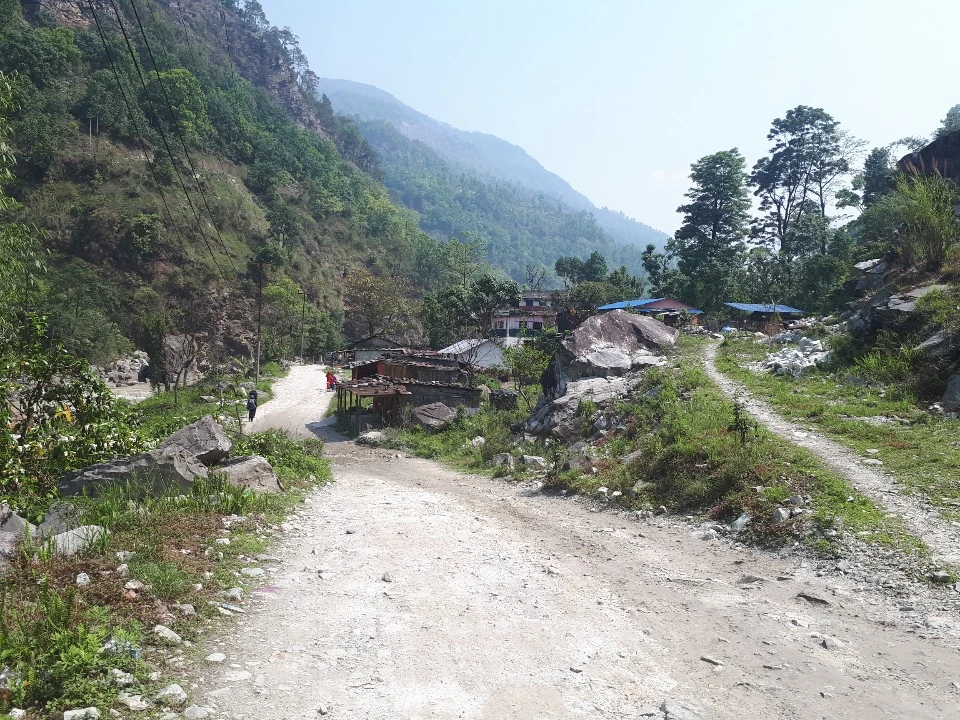 마을 입구에 들어서서 숙소를 향해 가는 길에 저 멀리 힘출리(Himchuli, 6441m) 산이 보인다.