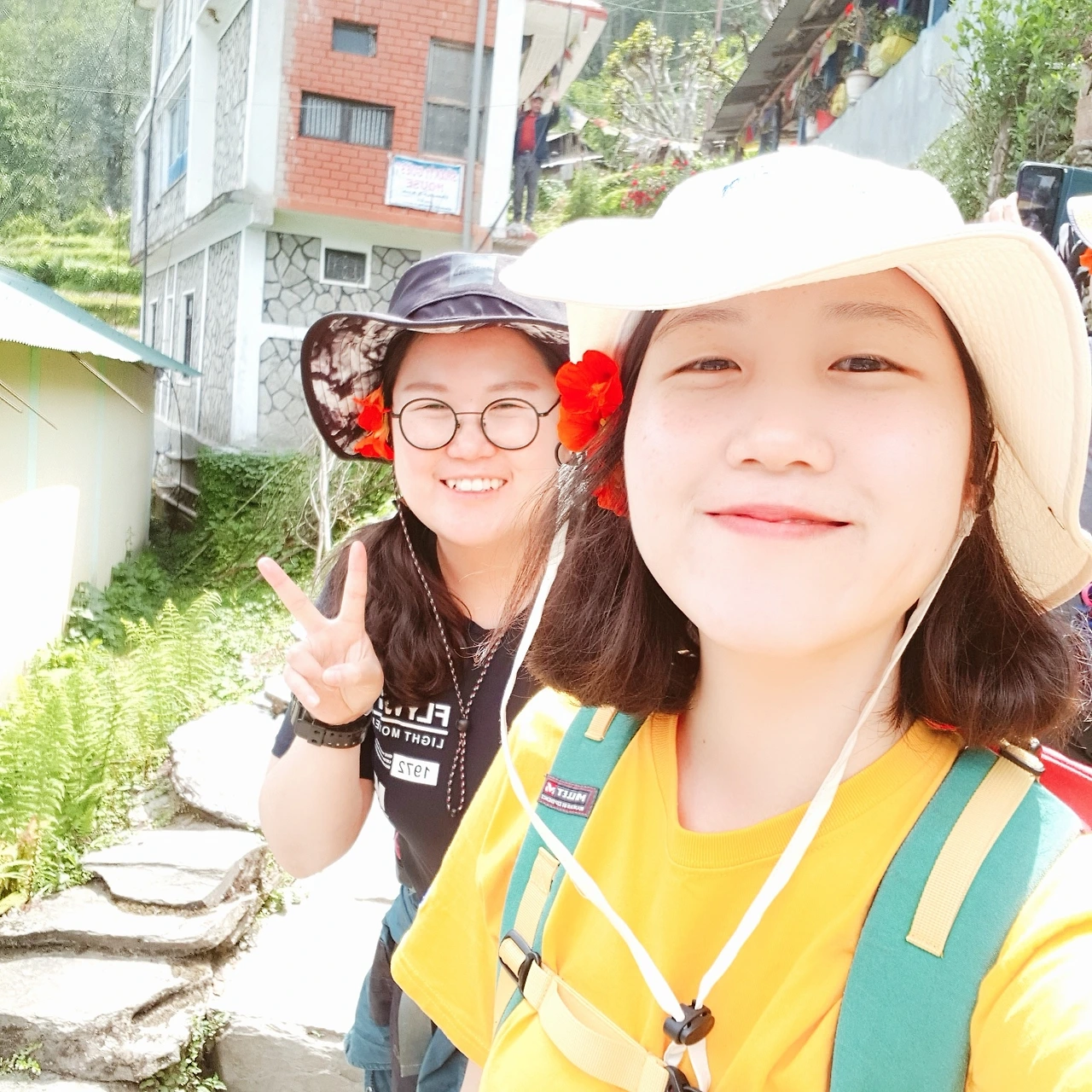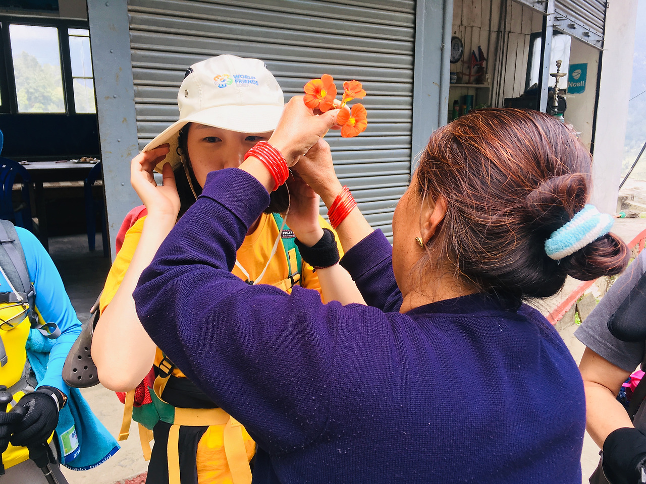 밥을 먹고 인사를 하고 떠나려는데 식당 아주머니와 아저씨들이 네팔에 또 놀라오라며 꽃을 꺾어 우리의 귀에 각각 하나씩 꽂아 주셨다!! 여자는 왼쪽, 남자는 오른쪽에 꽂는다고 했다.