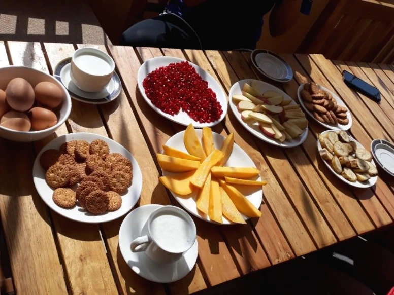 아침 식탁에는 갓 짜낸 버펄로 우유와 망고, 석류, 바나나, 삶은 계란과 감자 등이 메뉴로 올라왔다.