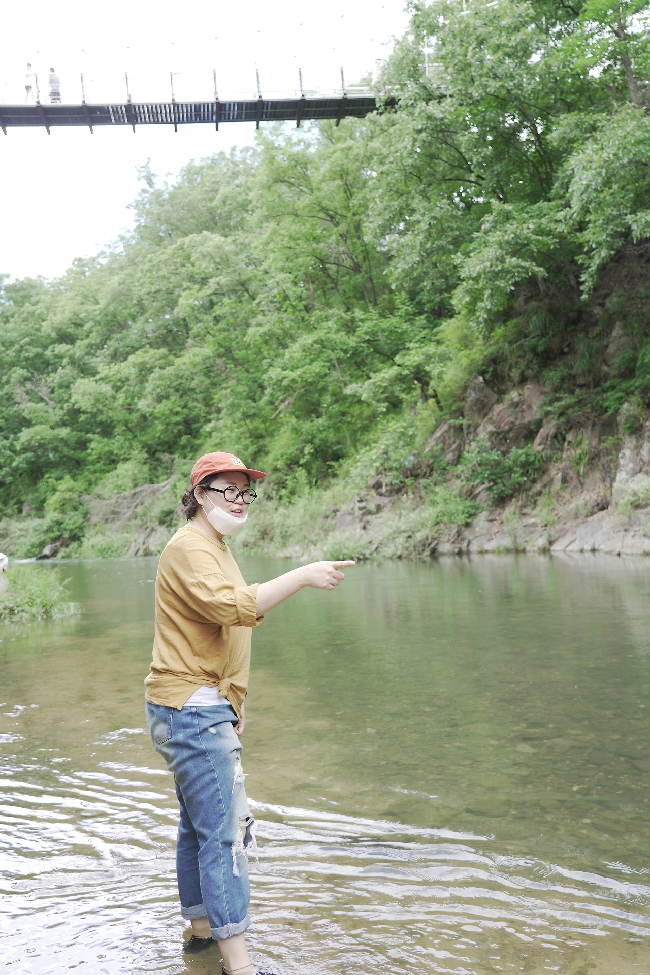 하늘다리를 건너고 계단을 쭉 내려가면 비둘기가 앉아있는 미니 출렁다리가 하나 더 있는데, 그 다리까지 건너서 밑으로 내려오면 물가에 발을 담글 수 있다. 발만 기분 내고 옴