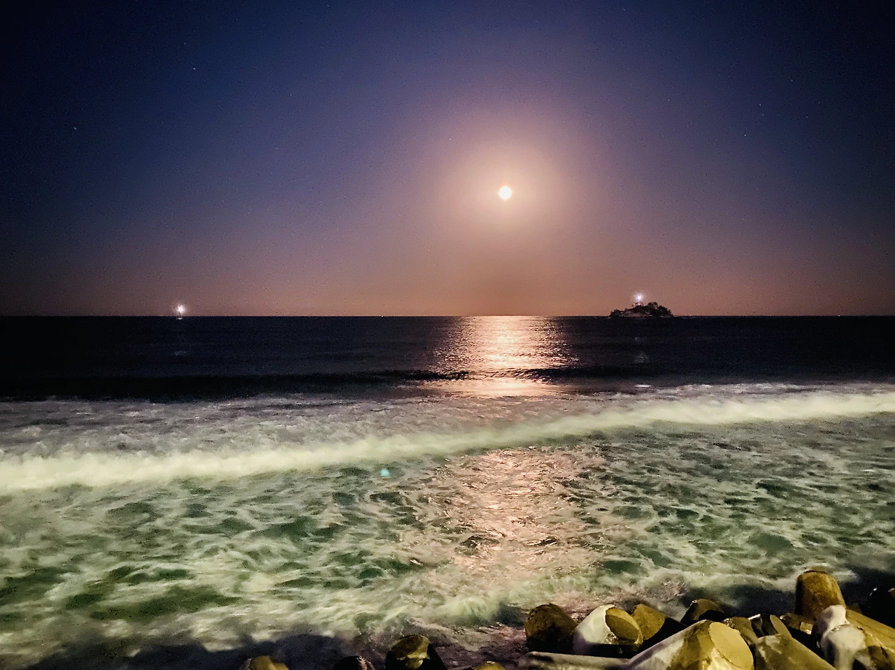 양양의 방파제 아래 펼쳐진 바다에 아까 그 달이 밝고 환하게 떠 있었다.