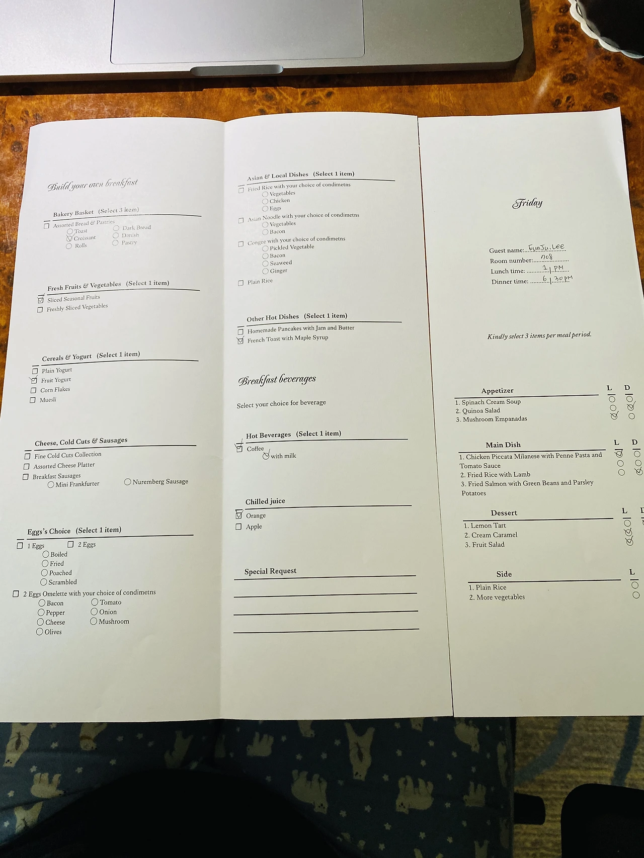 매일매일 의무적으로 유일하게 내가 해야 하는 일이 있었는데, 다름 아닌 다음날 식사 시간 및 메뉴를 선택해 방 밖에 내놓기였다.