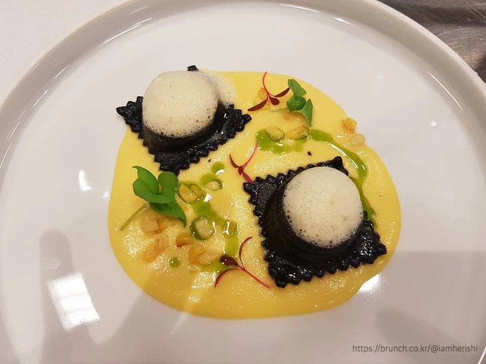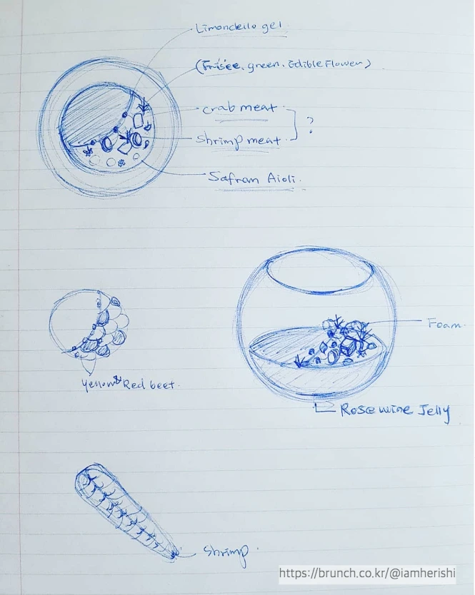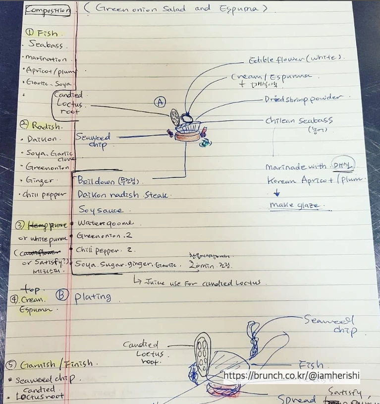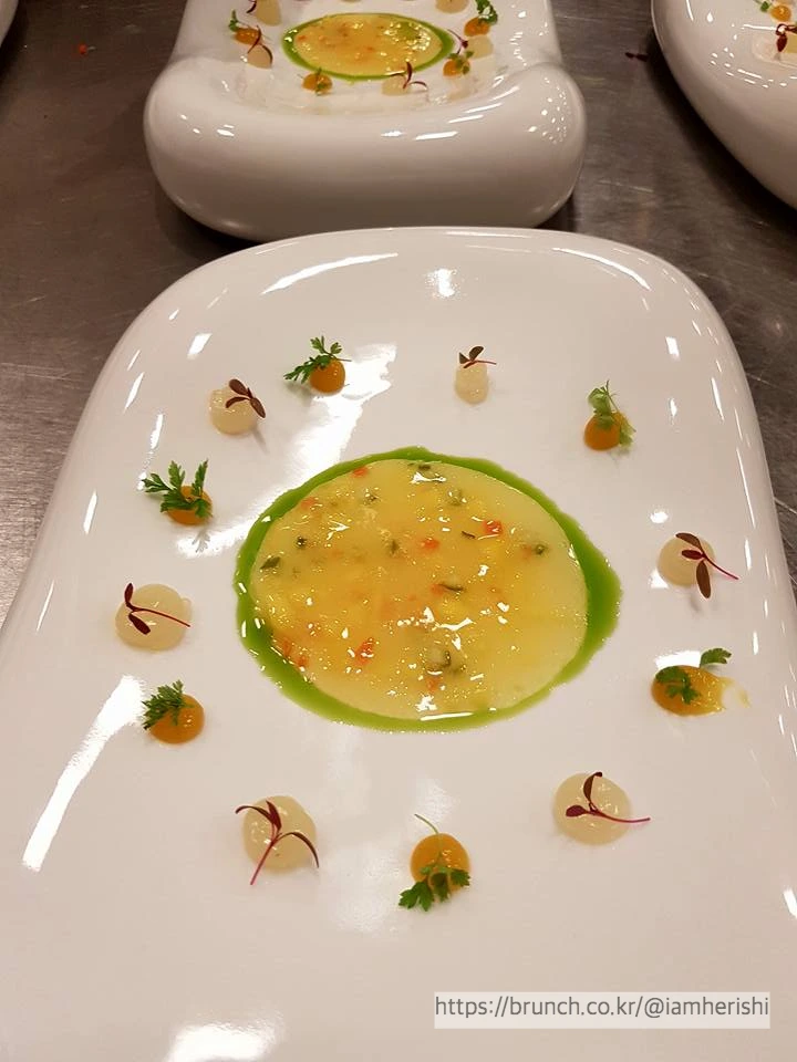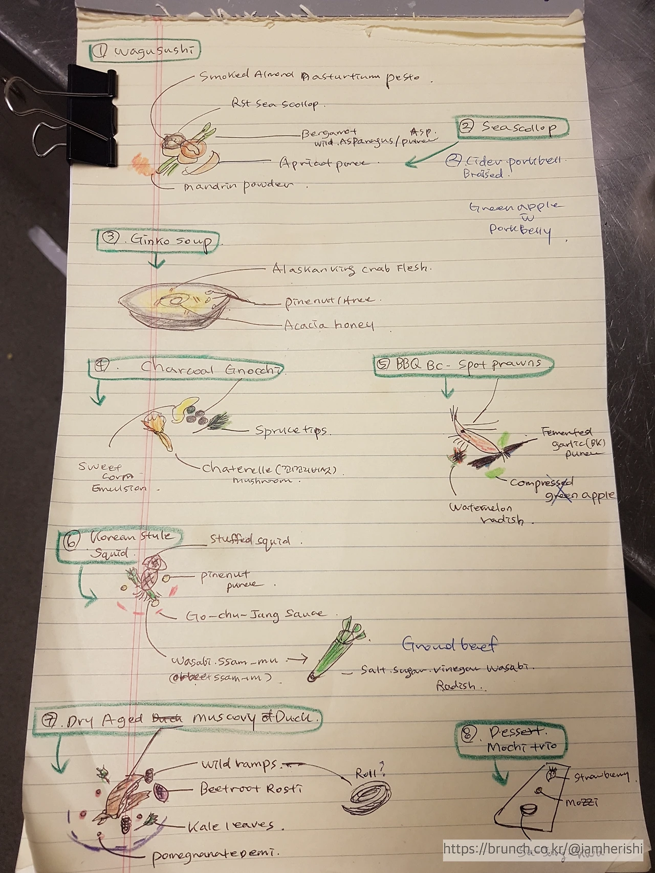 이런 생각을 늘 가지고 있던 나에게 어느 날 셰프가 VIP 손님들을 위한 코스요리 중 몇 가지 코스를 직접 창작해 보라는 숙제를 주었다. 나는 밤새 요리를 구상하고 계획을 그림으로도 표현해 설명했다. 여러 가지 창작요리들 중 한식을 소개할 수 있는 메뉴들도 넣었는데, 이렇게 셰프 레이와 함께 준비해 선보인 셰프의 테이블(Chef’s Table) 코스요리에서 여러 국적의 사람들에게 매우 뜨거운 반응을 얻게 되었다. 그 일을 계기로 나는 더욱더 용기를 얻어 고유한 한식 또는 서양요리와 한식을 접목한 요리들을 개발해 나갔다.