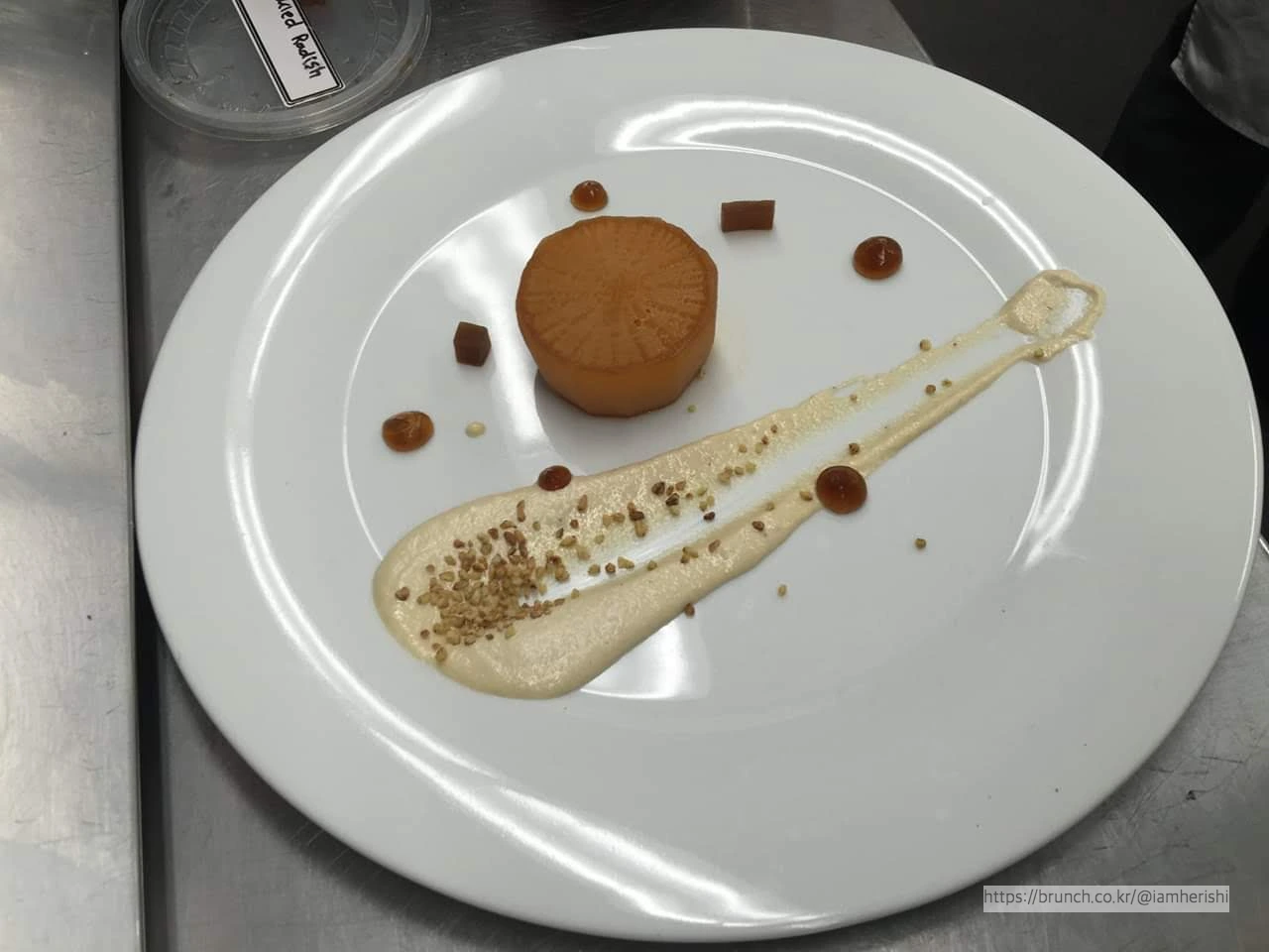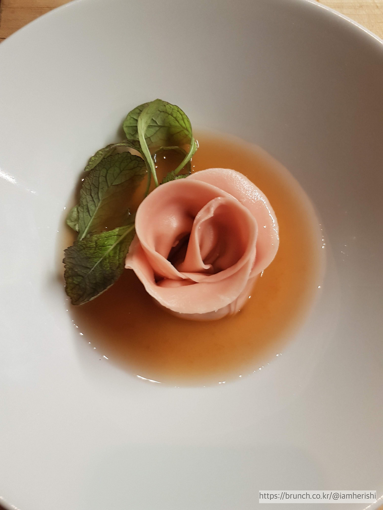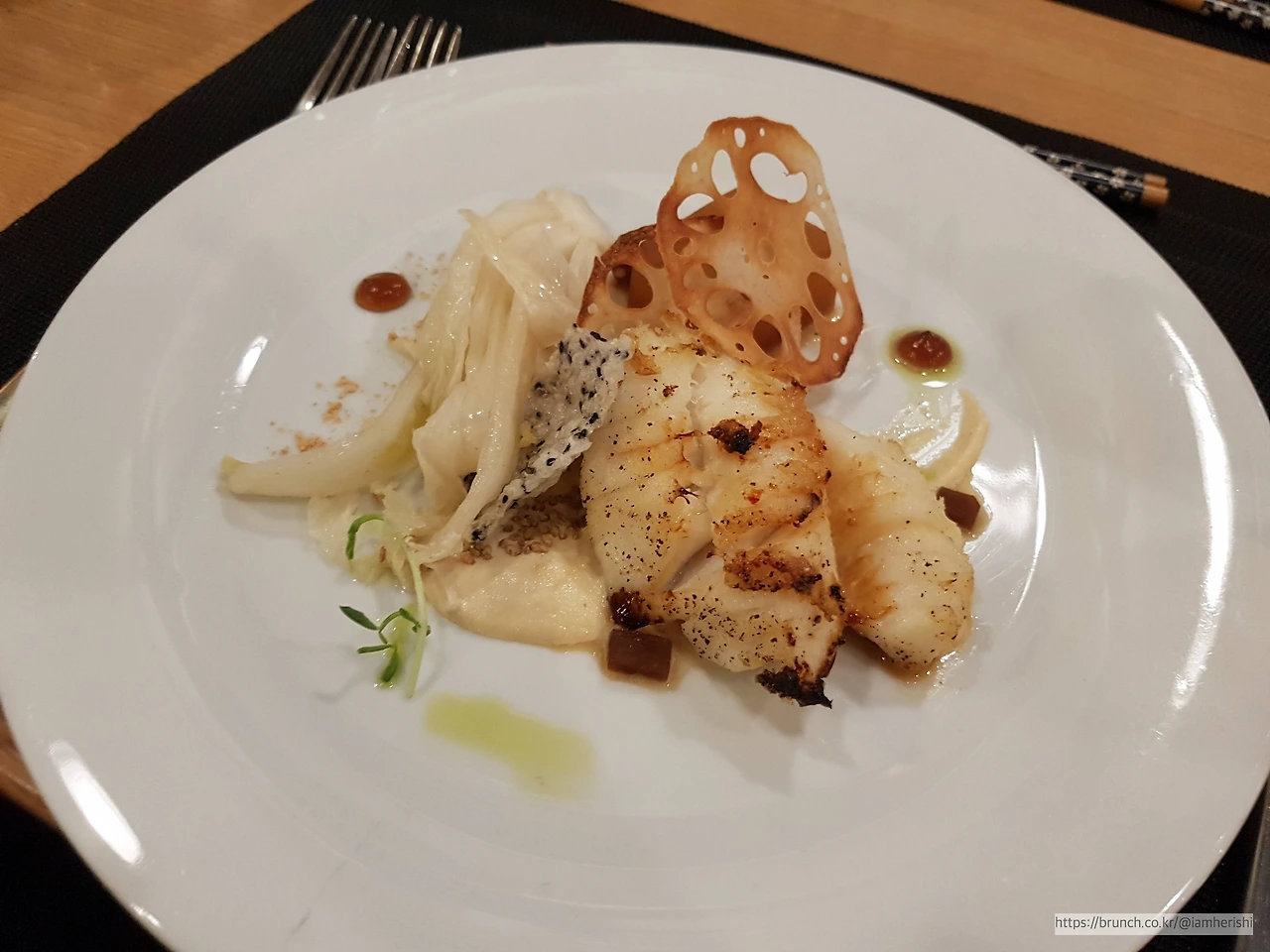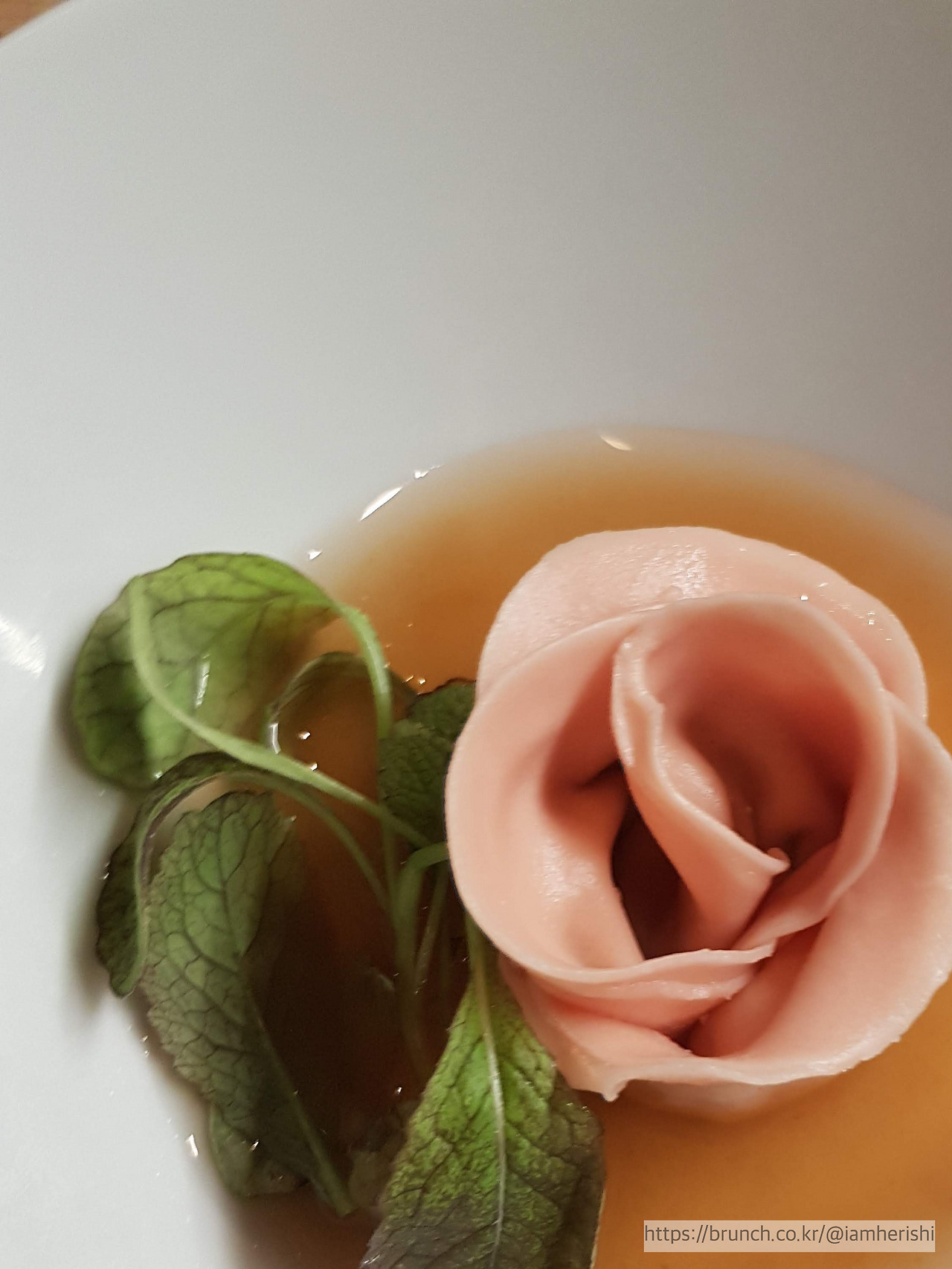 마지막 디저트는 찹쌀가루와 식용 꽃을 이용해 만든 화전과 호두곶감말이, 그리고 수정과를 만들고 그 옆에 솔잎에 잣을 끼워 함께 플레이팅 했다. 나의 요리는 본연의 맛에 충실하면서 나만의 스타일을 살려 접시에 담는 것이다. 시각적인 포인트를 살리되 멋을 부리기 위해 먹을 수 없거나 맛이 어울리지 않는 재료를 사용하지 않고 맛과 멋이 조화를 이룬 요리를 하려고 한다.