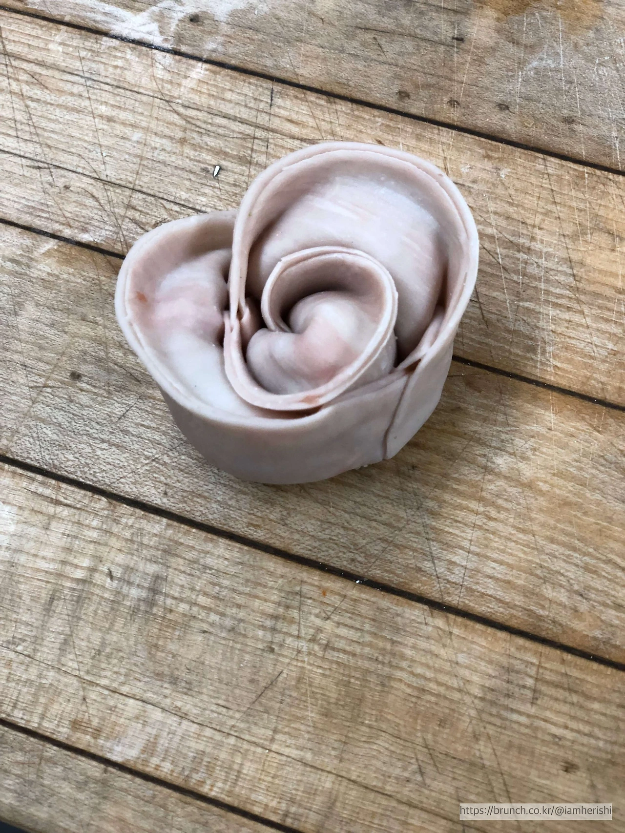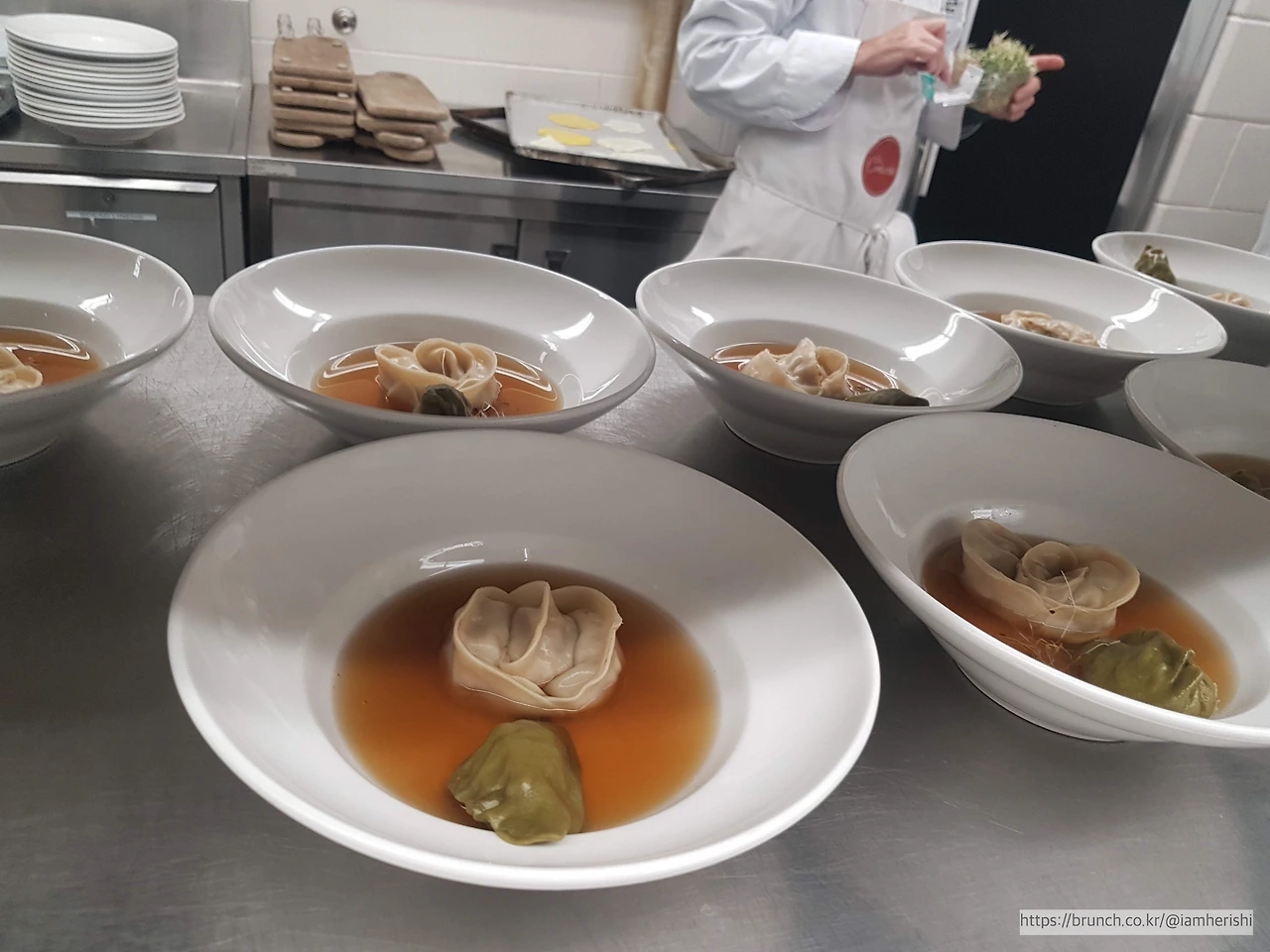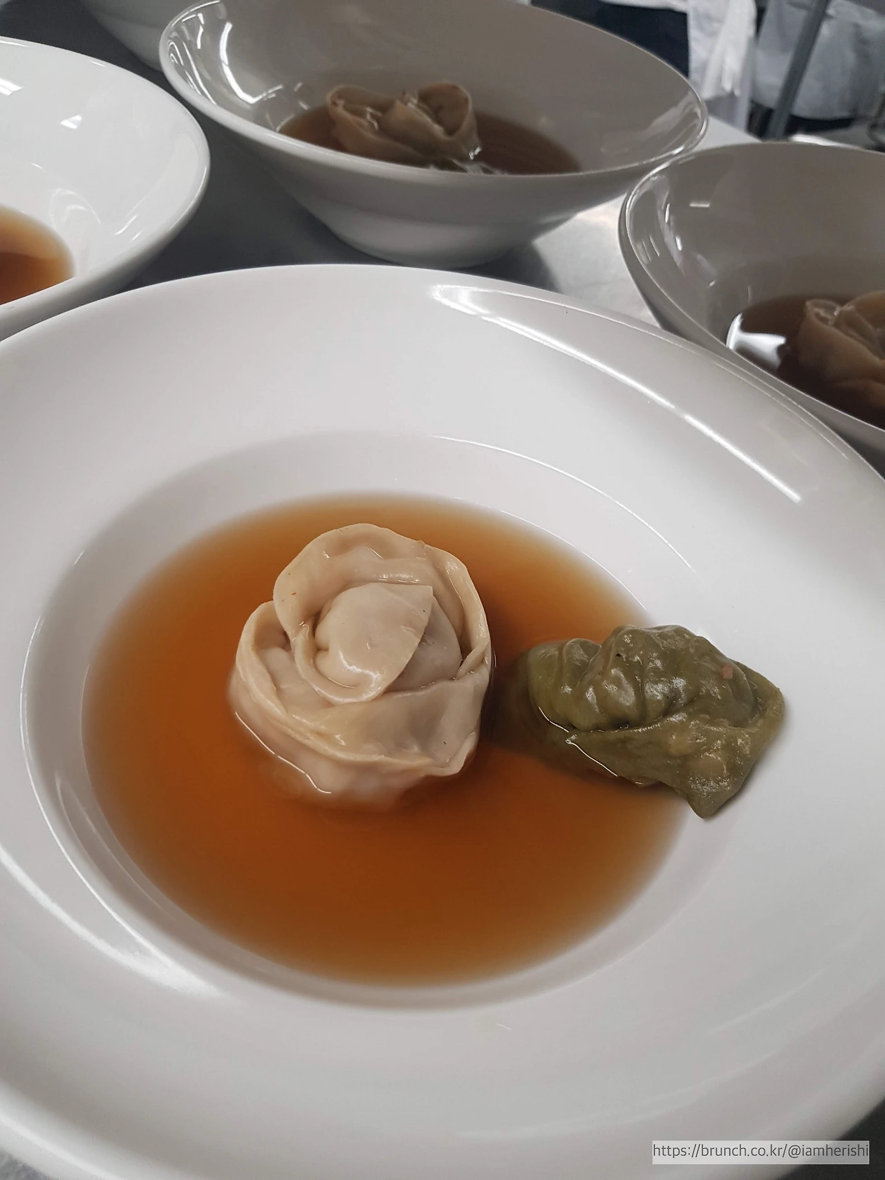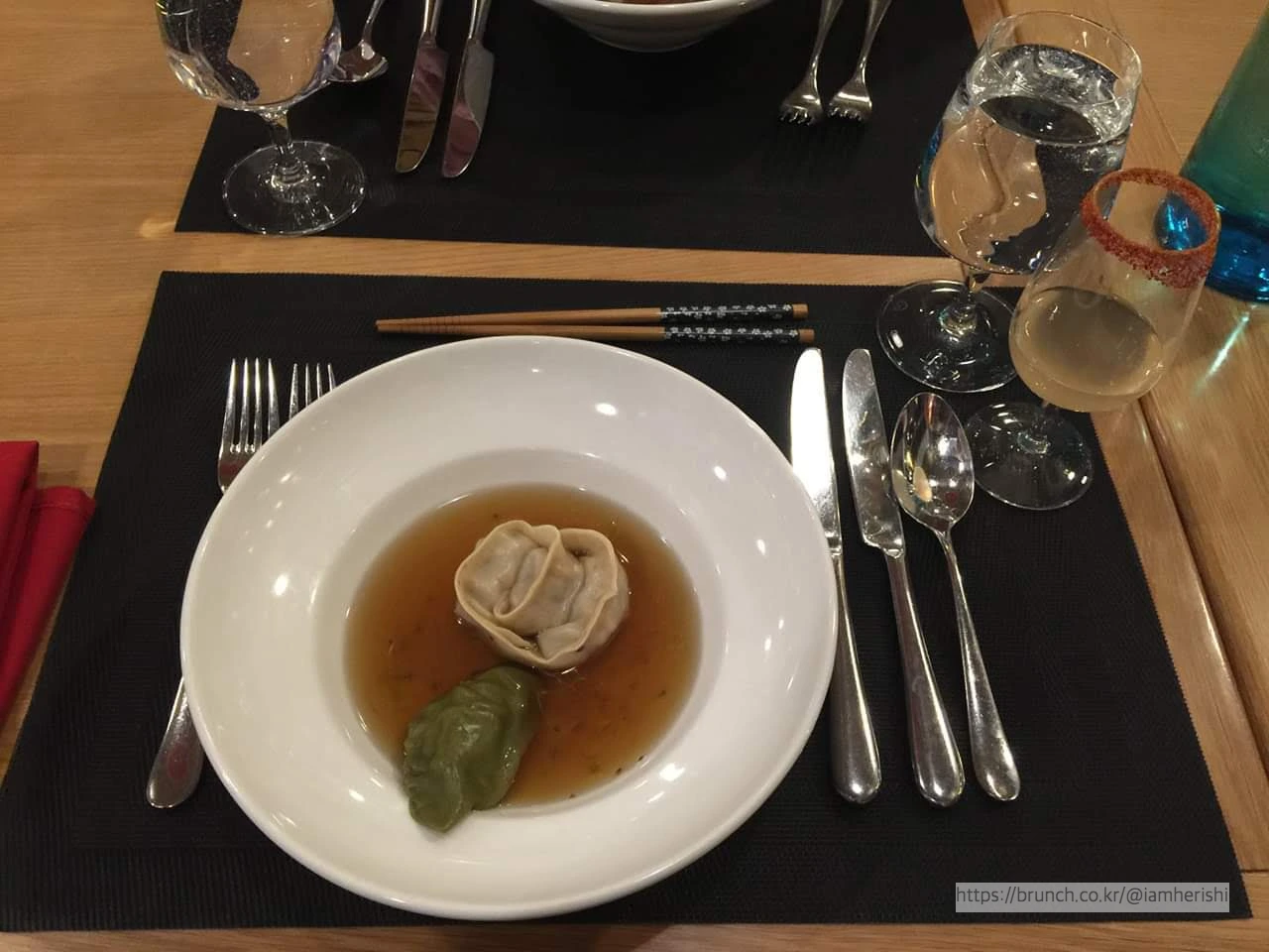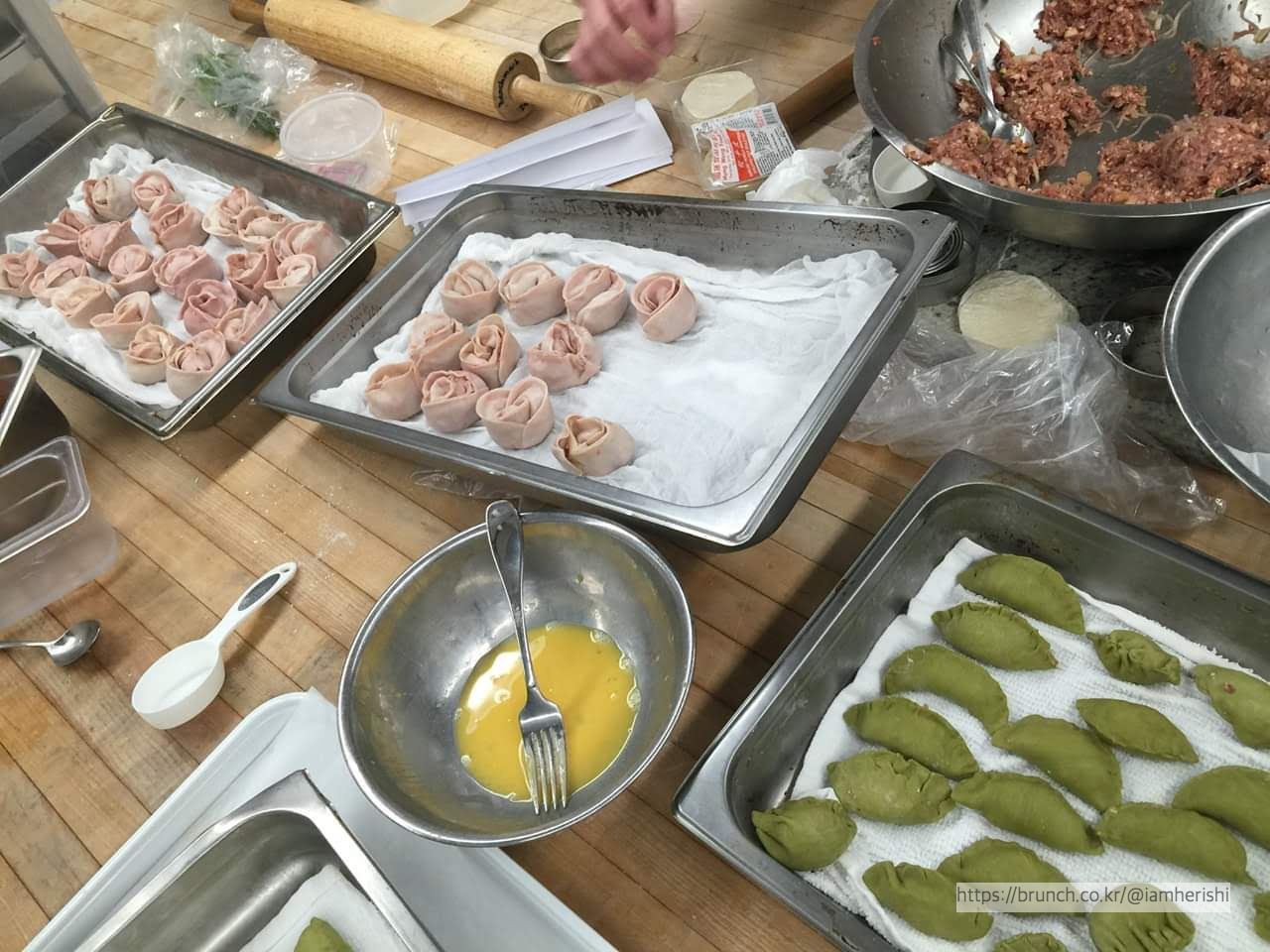 서양의 코스 요리에서 애피타이저는 보통 샐러드나 수프로 정해지는데, 나는 한국의 만둣국을 첫 번째 코스메뉴로 정했다. 만두 빚는 방법도 배우고 국물과 함께 즐길 수 있는 요리이기 때문이다. 만두피에 비트와 녹차를 이용해 색을 내는 법을 알려준 후, 모든 과정은 회원들이 직접 만들어 나갔다.