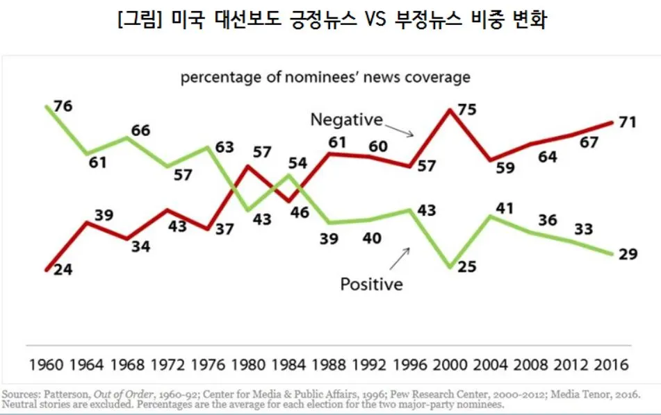 이 그림은 하버드대학 토머스 패터슨(Thomas E. Patterson) 정치학과 교수가 미국의 대선보도에 있어 긍정뉴스와 부정뉴스의 비중을 시계열적으로 살펴본 거다, 1960년의 경우 긍정 vs 부정 기사 76:24 이게 1980년대 들어 역전되기 시작하면서 2016년에는 긍정이 29%, 부정이 71%로 상황이 악화된다. 이 그림을 보다 보면 언론의 신뢰 위기는 “네거티브에 대한 강한 선호”가 아주 밀접하게 연관되어 있지 않을까, 그런 의심을 하게 된다. 영국 로이터저널리즘 연구소가 실시한 언론 신뢰도 조사에서 미국 역시 (우리보다 상황이 약간 좋기는 하지만) 38개 조사 대상국 꼴찌에서 7번째, 32위에 그치고 있다. 좀 더 경험적인 증거가 필요하지만 언론 신뢰도 순위와 부정 뉴스의 빈도 사이에는 밀접한 상관관계가 있다는 생각이 든다(이런 것을 굳이 통계적으로 검증할 필요는 없을 것 같다). 2015년 도널드 트럼프 대통령이 대선 유세에서 “언론은 의회보다 신뢰도가 더 낮다. 한마디로 인간쓰레기(scum)”라고 비난한 적이 있는데, 이 역시 유권자들이 부정적인 메시지에 의존하는 언론을 믿지 않는다는 확신이 있기 때문에 가능한 언어가 아니었나 싶다.