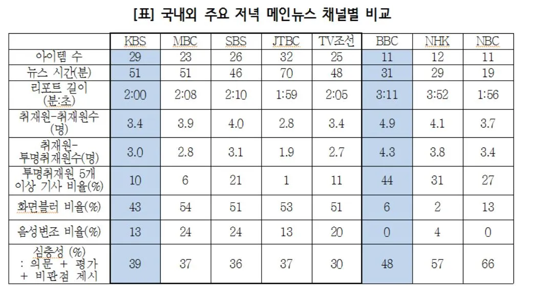 지난 2019년 9월 17일 ‘퀄리티 저널리즘(Quality Journalism)을 위한 탐색: 한국 TV뉴스의 품질’ 컨퍼런스가 삼성언론재단 주관으로 진행되었다. 여기서 숙명여대 미디어학부 배정근 교수 연구진은 2018년 한 해 동안 방송된 지상파 종편 메인 뉴스에서 월별로 이틀씩 총 24일간의 리포트를 추출해 리포트 길이, 심층성, 취재원의 숫자, 블러처리한 화면 등을 비교 분석한다. 이에 더해 2018년 뉴스 중에서 특별한 대형사건이 없었던 1주일간 발생했던 뉴스의 포맷을 BBC, NBC, NHK 뉴스와 비교하는데, 이 내용이 흥미롭다.