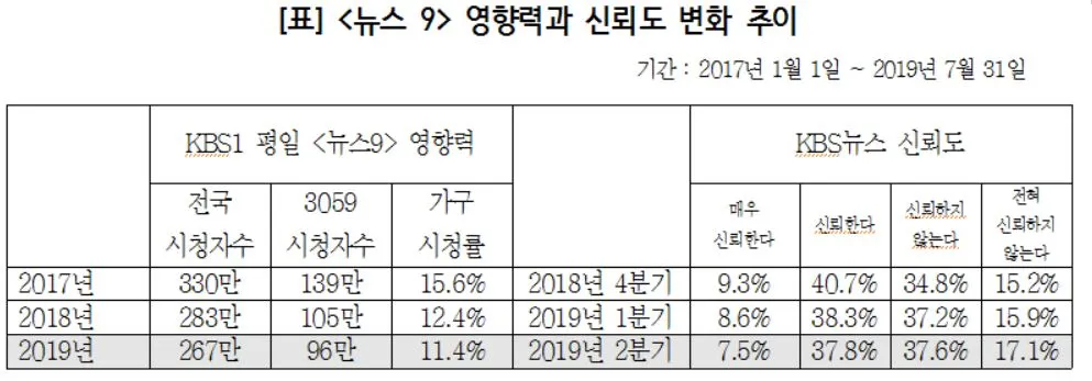 2019년 1월 1일, KBS 뉴스는 지금까지와는 달라진 모습을 보여주겠다며 저녁 뉴스를 대대적으로 개편한다. 7시 종합뉴스로 확대, 9시 메인뉴스로 심층성을 강화해 깊이 있는 정보를 제공하겠다는 것이 목표였다. 이 개편을 통해 영향력과 신뢰도에 어떤 변화가 있었을까? 슬프게도 영향력과 신뢰도 모두 상황은 모두 좋지 않습니다. 영향력을 가늠하는 시청자 규모는 2017년 330만 명에서 2018년 283만 명, 그리고 금년에는 267만 명으로 떨어졌고(닐슨코리아 제공), KBS 뉴스를 신뢰하지 않는다(신뢰하지 않는다 + 전혀 신뢰하지 않는다)고 응답한 시청자는 2018년 4분기 50.0%에서 2019년 1분기 53.1%, 2019년 2분기 54.7%로 늘어났다(KBS 공영미디어연구소 제공).