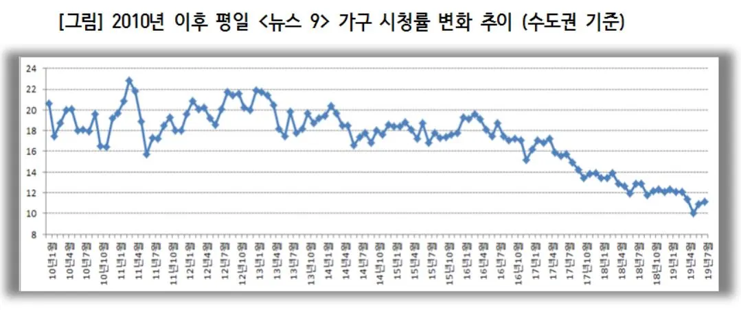 KBS <뉴스 9> 현재 시청률은 10년 전 대비하여 절반 수준이고(비단 “뉴스 9”만 그런 것은 아니고, 지상파 채널의 모든 콘텐츠에서 공히 드러나는 현상이다.), 경쟁력 하락 속도는 2016년~2017년 전후로 하여 매우 빨라졌으며, 이 구조적이고 장기적인 흐름을 1~2년의 변화로 바꿀 수 있다고 생각하는 것은 큰 오산이다. 아주 긍정적으로 KBS 내부의 변화가 발빠르게 잘 이루어진다 해도, 그보다 빠르게 변하는 외부 환경, 가령 1) 모바일 등 디지털 미디어의 성장과 이와 맞물린 TV 시청량의 감소 2) 평일 저녁 시간대 여가시간 및 TV 이용 패턴의 변화, 좀 더 구체적으로 저녁 9시에서 8시로 한 시간 앞당겨진 뉴스 시청시간의 변화 3) KBS1 일일드라마의 경쟁력 하락(인접효과의 감소) 4) MBC, tvn, jtbc 미니시리즈의 9시대 전진 배치 등 주요 드라마, 예능의 격전지가 된 저녁 9시대 경쟁상황의 변화 등등이 내부의 변화를 잘 이끌어내더라도 예전만큼의 시청률 수치가 나올 수 없게 만드는 이유로 작동하고 있다.