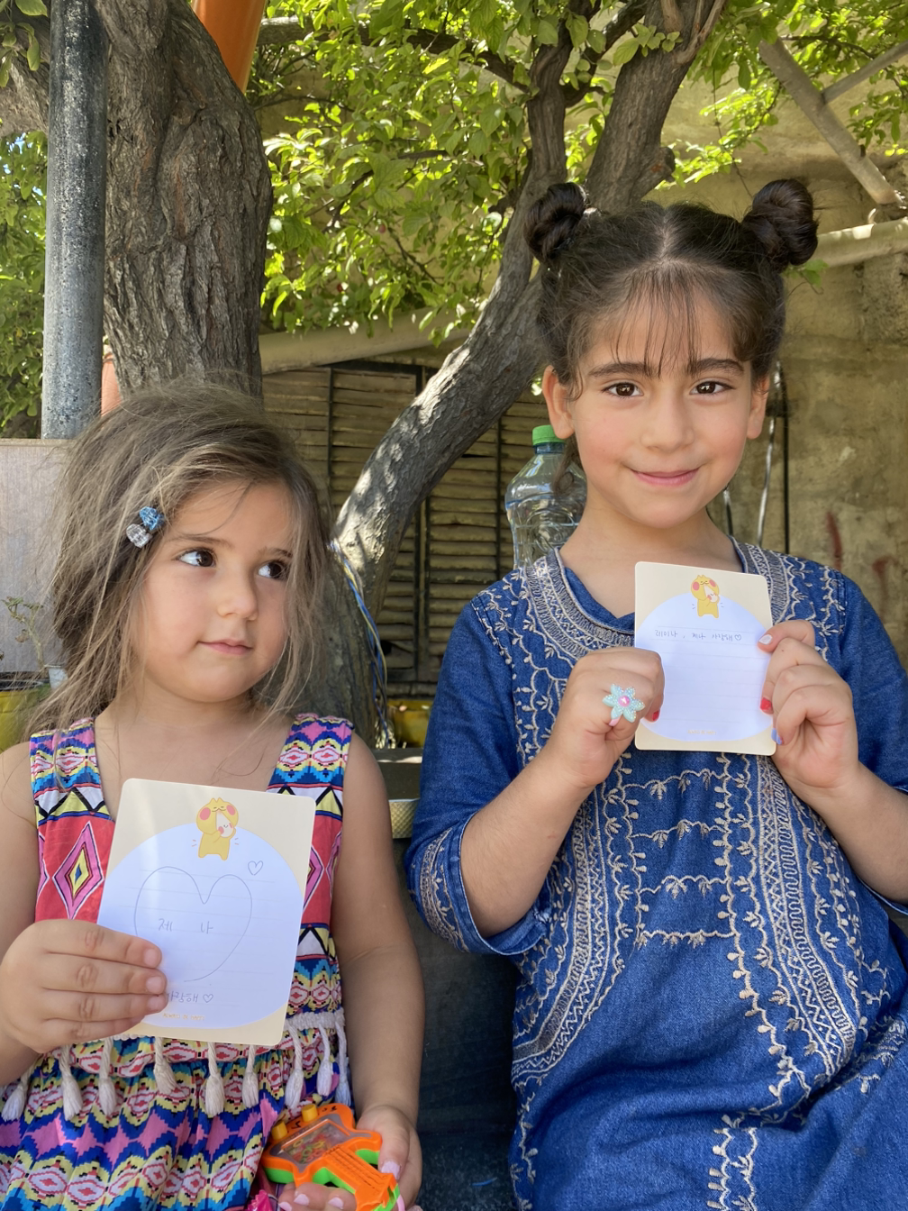 가져간 색연필과 크레파스를 꺼내 함께 그림놀이도 했다. 매니큐어를 발라주기도 했다. 우리나라에서는 쉽게 구할 수 있는 것들이라 귀한 것인줄 몰랐지만 팔레스타인 아이들에게는 처음 경험한 것들이라고 했다. 서로에게 손편지도 써주었다. 삐뚤빼뚤 각자의 언어로 편지에 진심을 담았다. 편지를 교환하며 글의 의미도 간단히 설명해 주었다. 이해했을지는 물음표지만 서로의 진심을 나눈 것에서 우리는 충분히 만족했다.