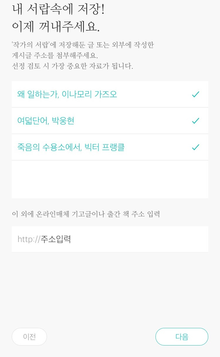 ‘작가의 서랍’에 저장해둔 글 또는 외부에 작성된 게시글 주소를 첨부해 주세요. 선정 검토 시 가장 중요한 자료가 됩니다.