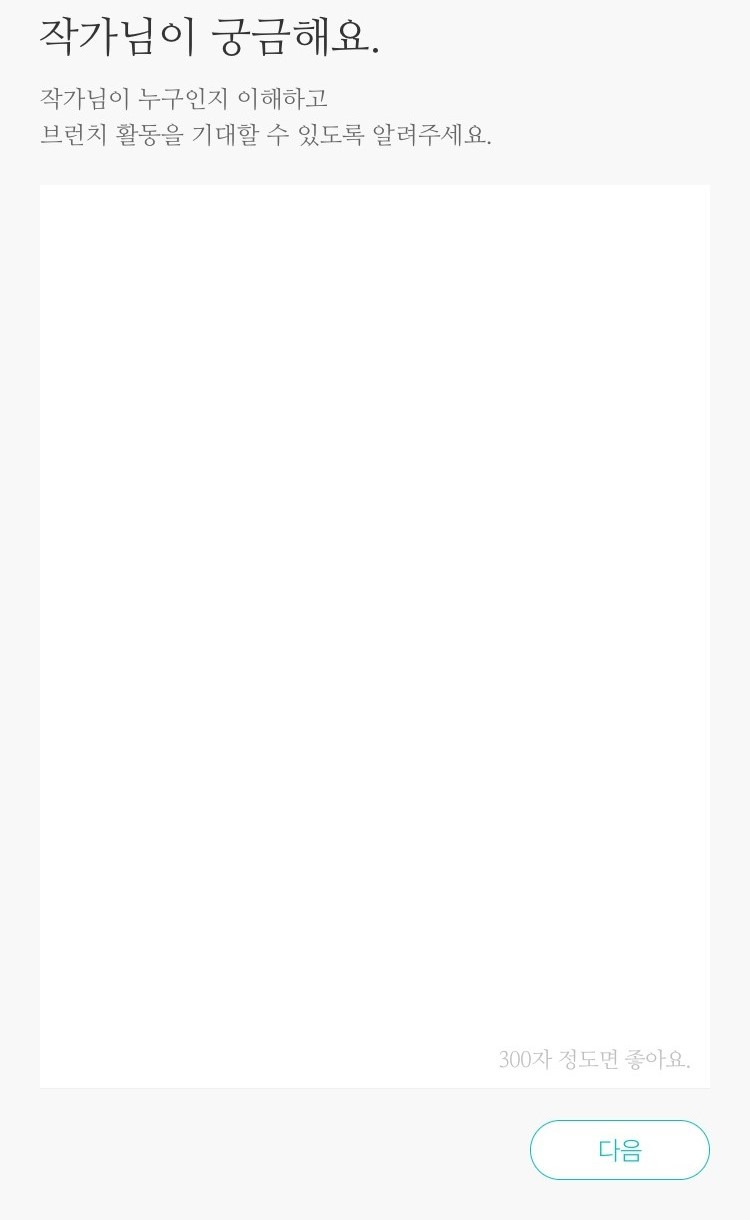 1. '브런치에 발행하는 나의 첫 글이다'라는 생각으로 한번 적어보세요. 글자 수에 집착하지 말고 자기소개 및 활동 계획을 적어봅니다. 생각보다 글쓰기에 소요되는 시간이 길어질 것입니다. 글을 쓰는 시간도 오래 걸릴 것이고요.