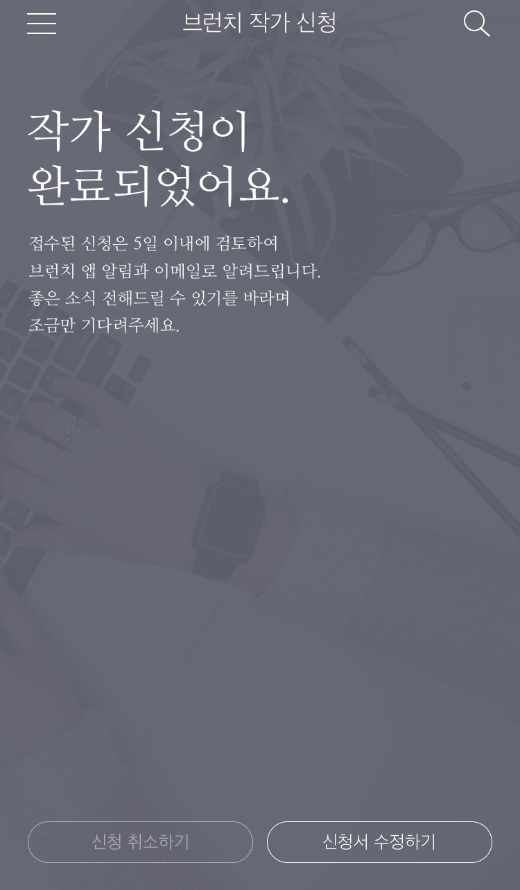 접수된 신청은 5일 이내에 검토하여 브런치 앱 알림과 이메일로 알려드립니다. 좋은 소식 전해 드릴 수 있기를 바라며 조금만 기다려 주세요.