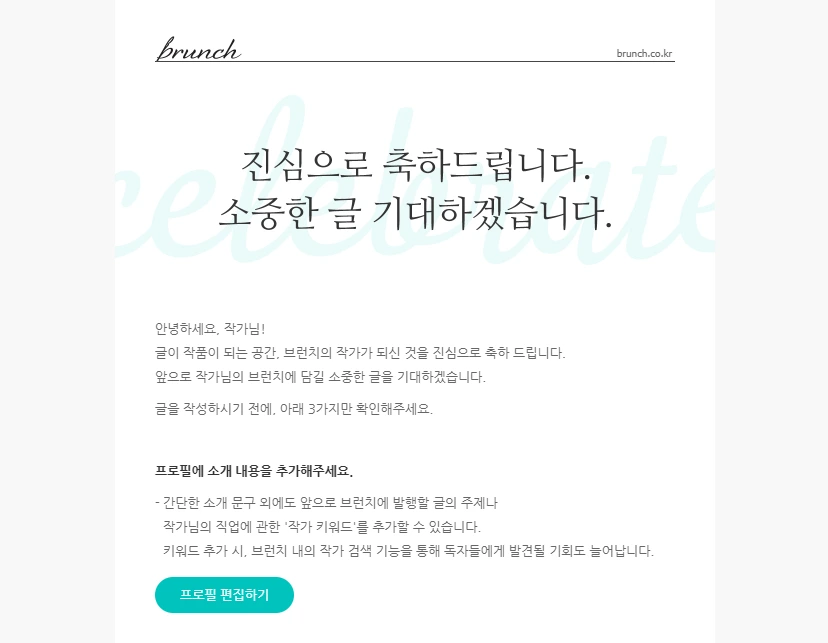 작가님이라는 생소한 단어와 함께 휴대폰에 알림이 떴습니다. 5일을 생각하고 있었는데 신청한 다음날에 메일이 오더군요. 확인을 해 보니 브런치 작가 합격을 알리는 축하 메일입니다. 내용에는 프로필 편집하기, 에디터 가이드 보기, 주의사항 3가지가 있고요.