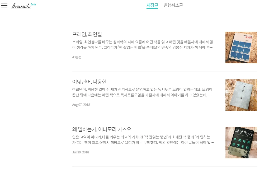 저는 브런치 활동 계획에서 초기에는 책 위주로 전달할 것임을 명시해 두었기 때문에 책 서평에 대한 3개의 글을 저장해두었습니다. (수정할 것이 참 많이 보이네요)