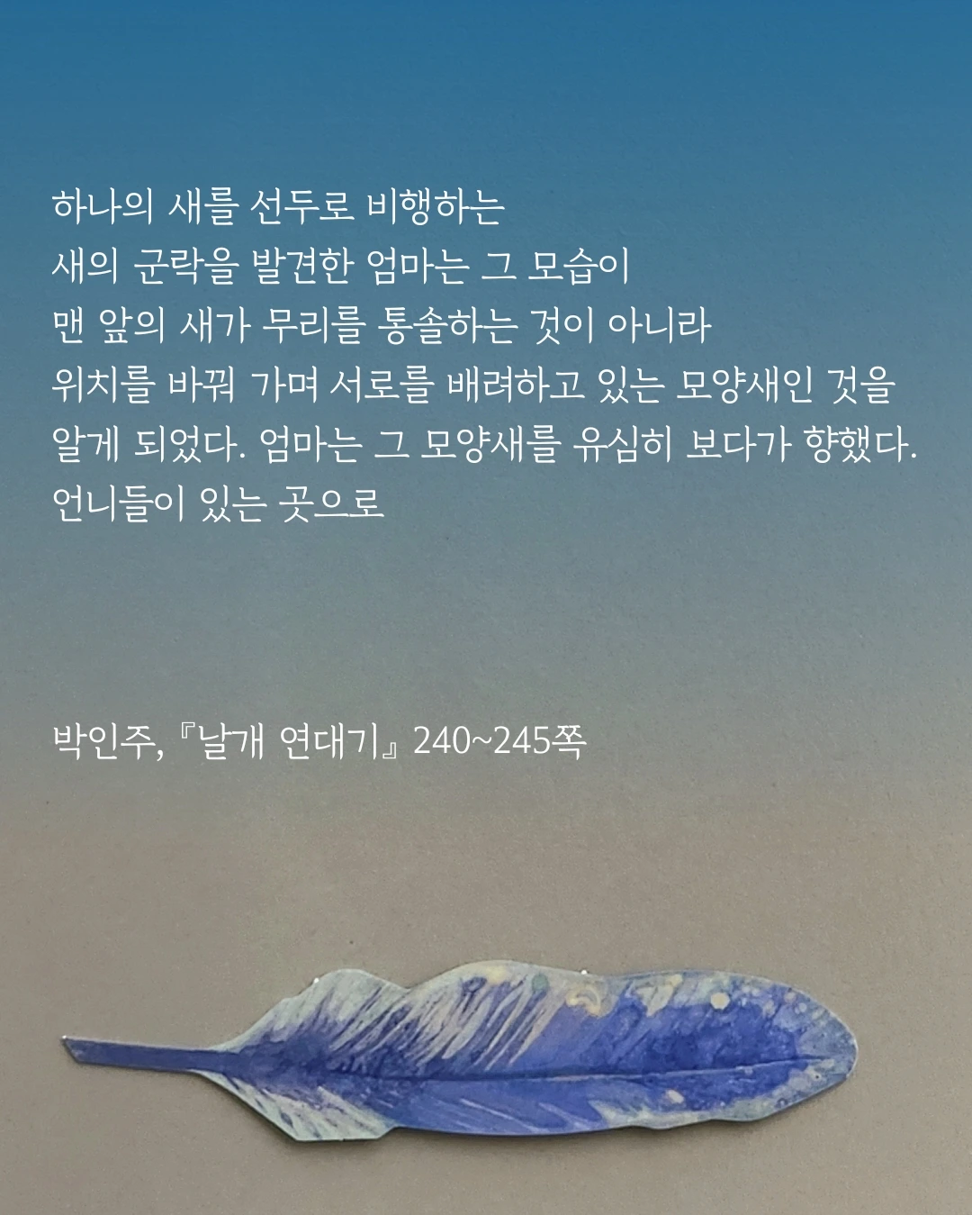 하나의 새를 선두로 비행하는 새의 군락을 발견한 엄마는 그 모습이 맨 앞의 새가 무리를 통솔하는 것이 아니라 위치를 바꿔 가며 서로를 배려하고 있는 모양새인 것을 알게 되었다. 엄마는 그 모양새를 유심히 보다가 향했다. 언니들이 있는 곳으로 (pp. 240~245)