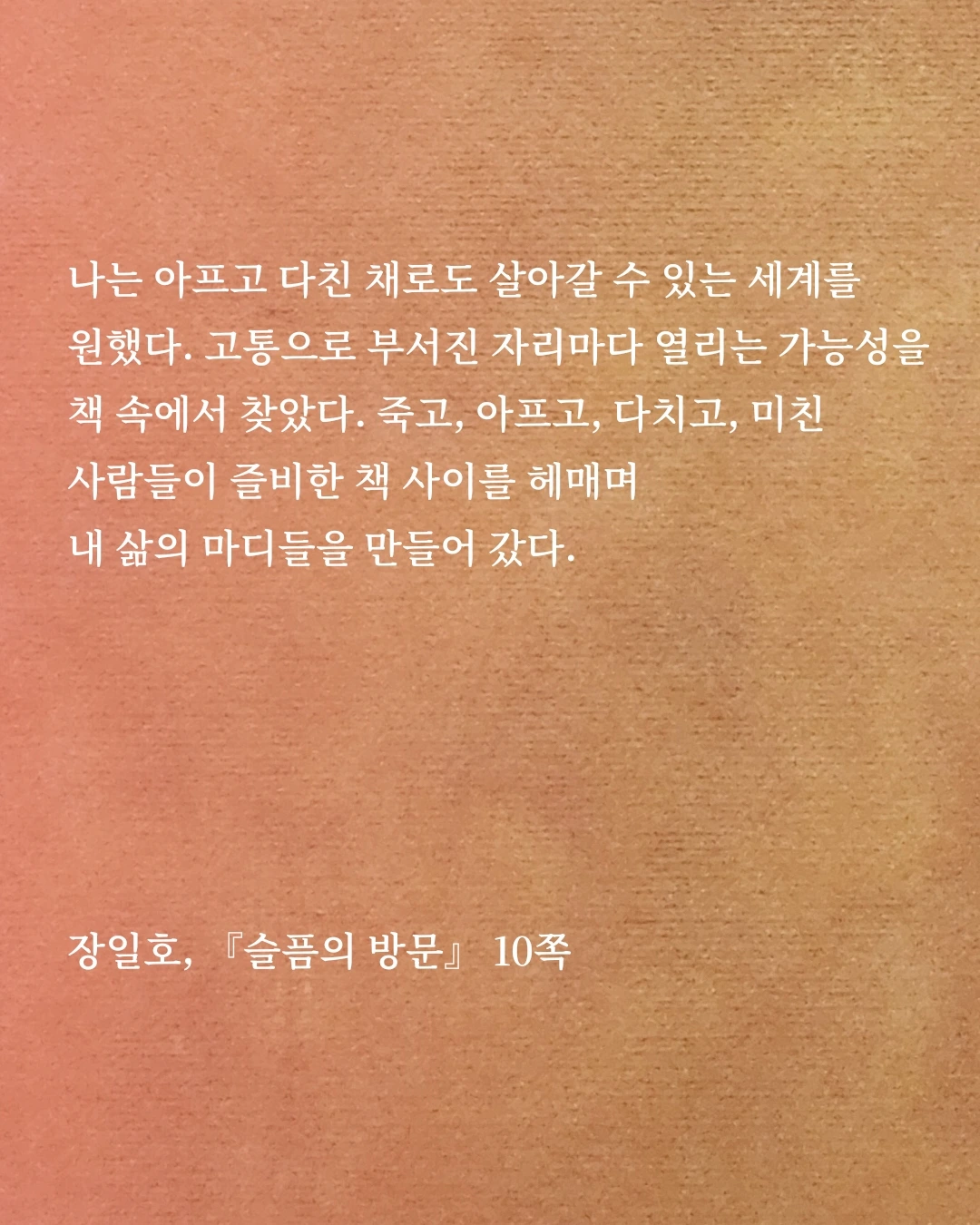 나는 아프고 다친 채로도 살아갈 수 있는 세계를 원했다. 고통으로 부서진 자리마다 열리는 가능성을 책 속에서 찾았다. 죽고, 아프고, 다치고, 미친 사람들이 즐비한 책 사이를 헤매며 내 삶의 마디들을 만들어 갔다. (p. 10)