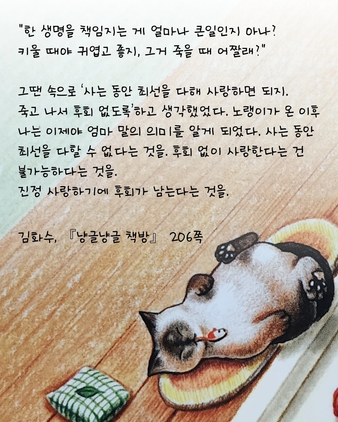 그땐 속으로 ‘사는 동안 최선을 다해 사랑하면 되지. 죽고 나서 후회 없도록’하고 생각했었다. 노랭이가 온 이후 나는 이제야 엄마 말의 의미를 알게 되었다. 사는 동안 최선을 다할 수 없다는 것을. 후회 없이 사랑한다는 건 불가능하다는 것을. 진정 사랑하기에 후회가 남는다는 것을. (p. 206)