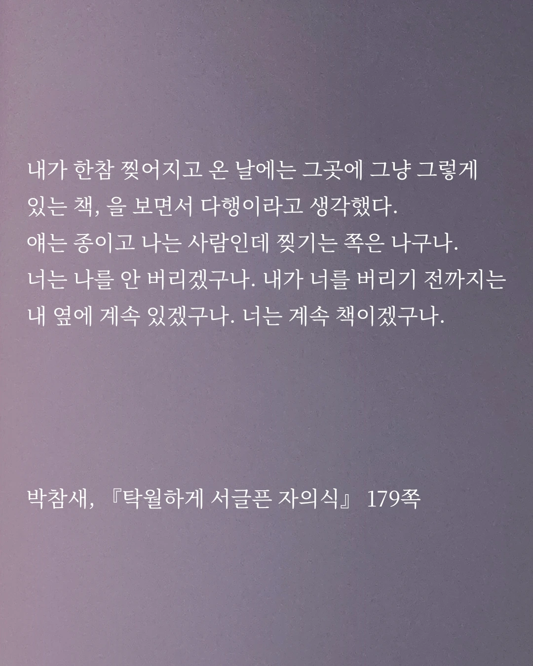 내가 한참 찢어지고 온 날에는 그곳에 그냥 그렇게 있는 책, 을 보면서 다행이라고 생각했다. 얘는 종이고 나는 사람인데 찢기는 쪽은 나구나. 너는 나를 안 버리겠구나. 내가 너를 버리기 전까지는 내 옆에 계속 있겠구나. 너는 계속 책이겠구나. (p. 179)