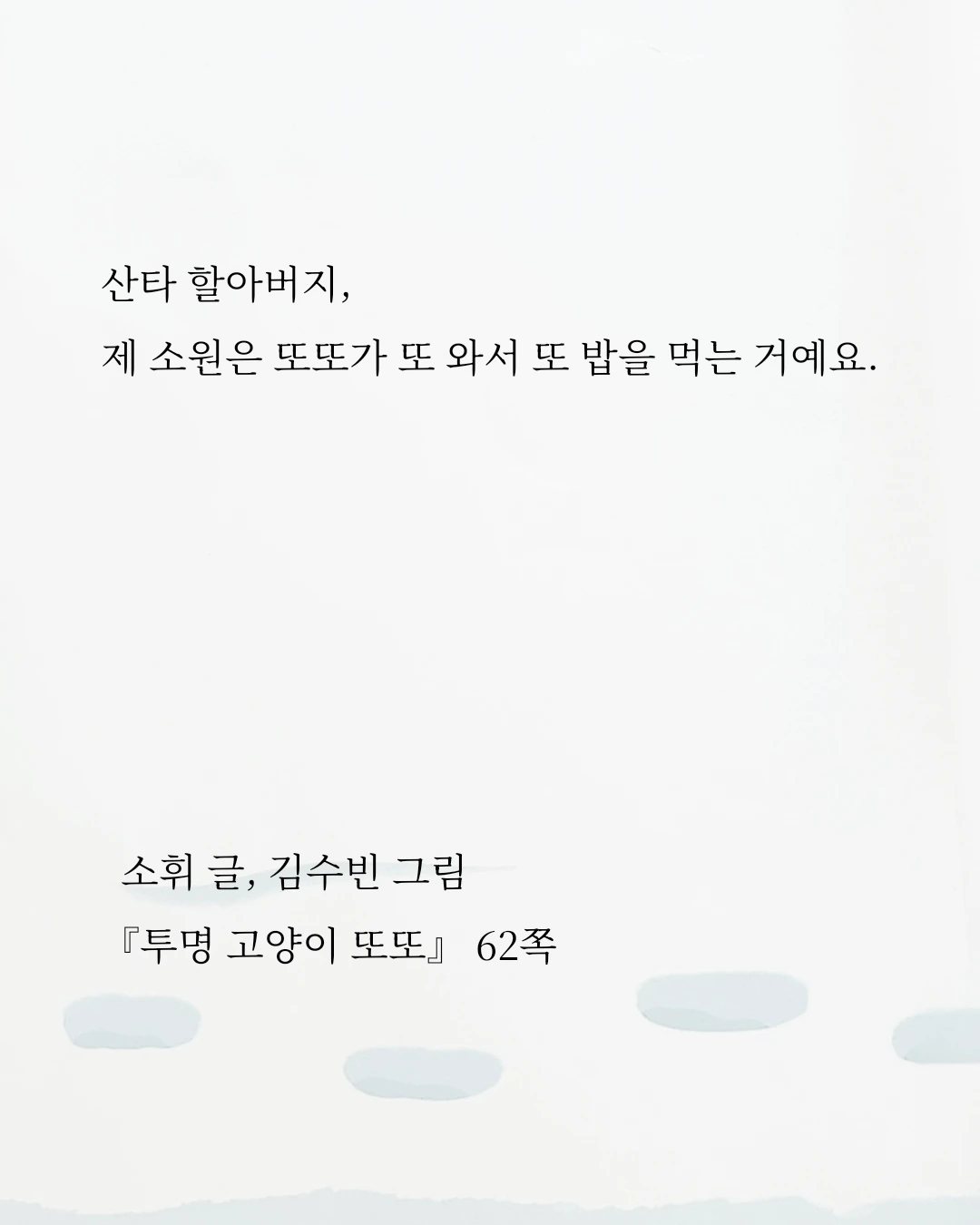 ‘산타 할아버지, 제 소원은 또또가 또 와서 또 밥을 먹는 거예요.’ (p. 62)