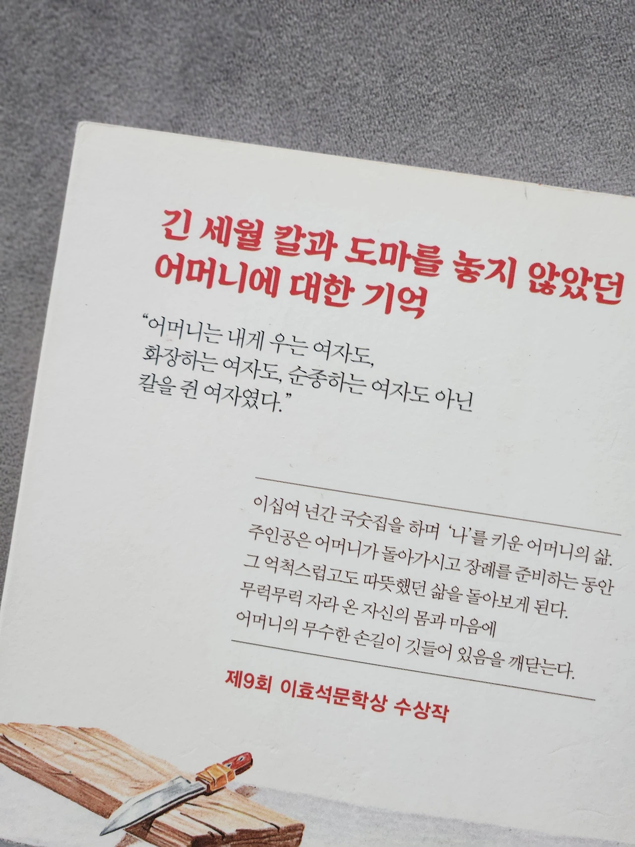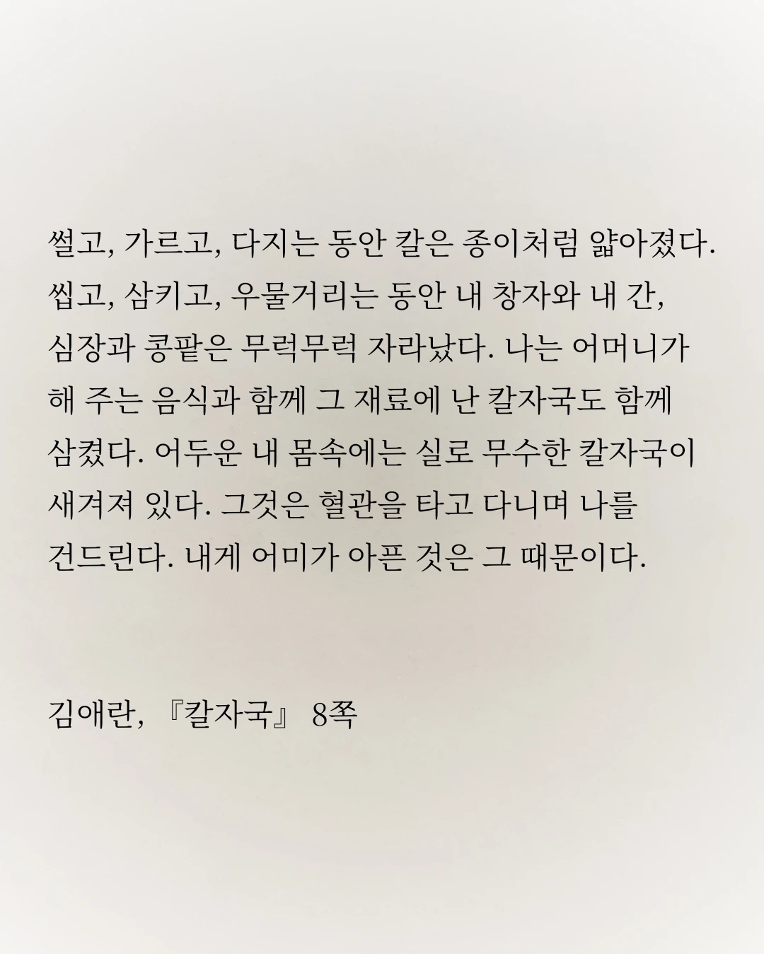 썰고, 가르고, 다지는 동안 칼은 종이처럼 얇아졌다. 씹고, 삼키고, 우물거리는 동안 내 창자와 내 간, 심장과 콩팥은 무럭무럭 자라났다. 나는 어머니가 해 주는 음식과 함께 그 재료에 난 칼자국도 함께 삼켰다. 어두운 내 몸속에는 실로 무수한 칼자국이 새겨져 있다. 그것은 혈관을 타고 다니며 나를 건드린다. 내게 어미가 아픈 것은 그 때문이다. 기관들이 다 아는 것이다. 나는 ‘가슴이 아프다’는 말을 물리적으로 이해한다. (p. 8)