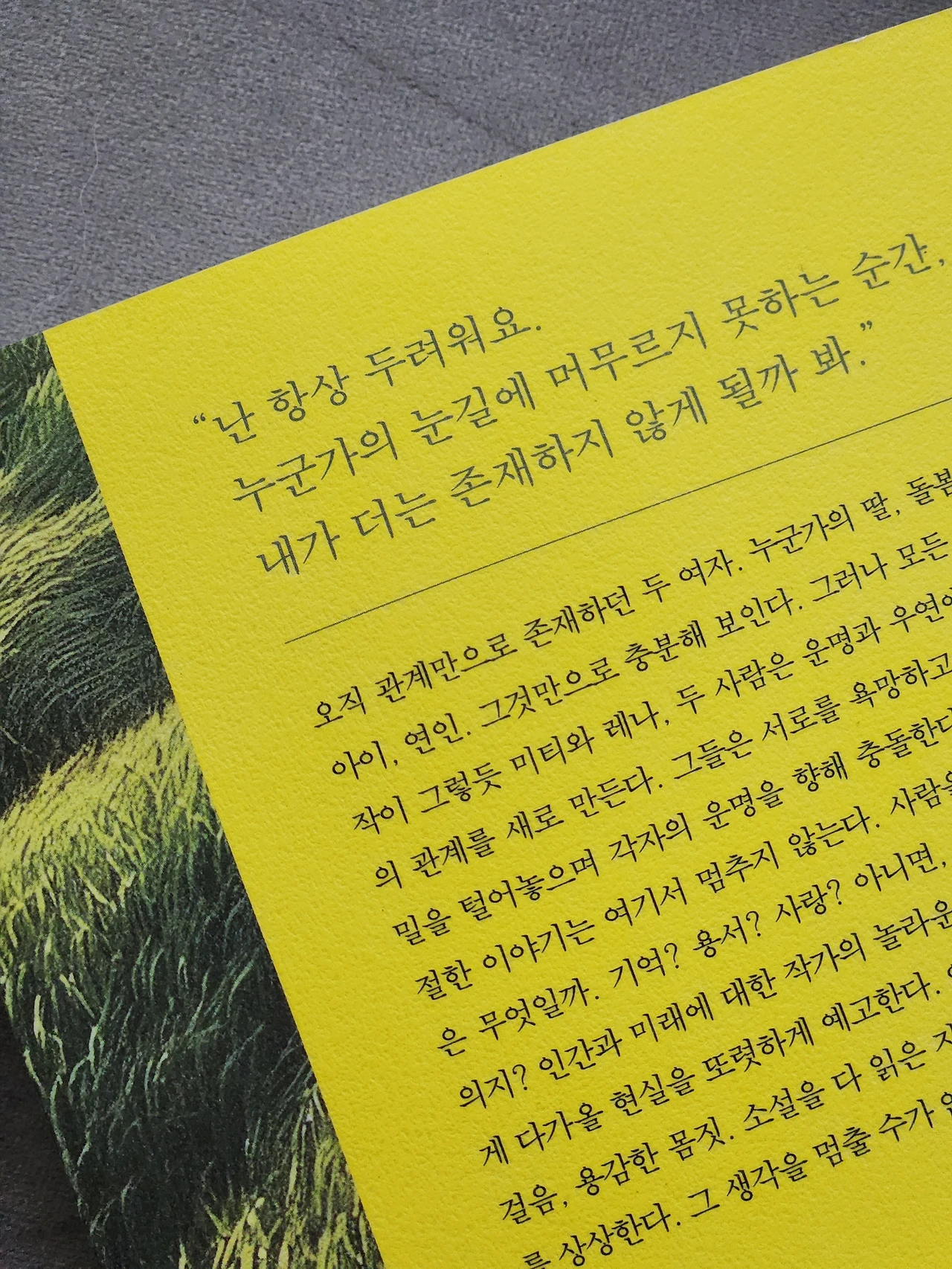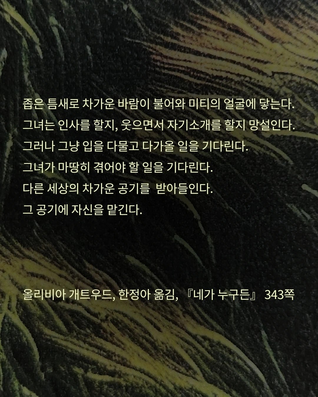 좁은 틈새로 차가운 바람이 불어와 미티의 얼굴에 닿는다. 그녀는 인사를 할지, 웃으면서 자기소개를 할지 망설인다. 그러나 그냥 입을 다물고 다가올 일을 기다린다. 그녀가 마땅히 겪어야 할 일을 기다린다. 다른 세상의 차가운 공기를 받아들인다. 그 공기에 자신을 맡긴다. (p. 343)