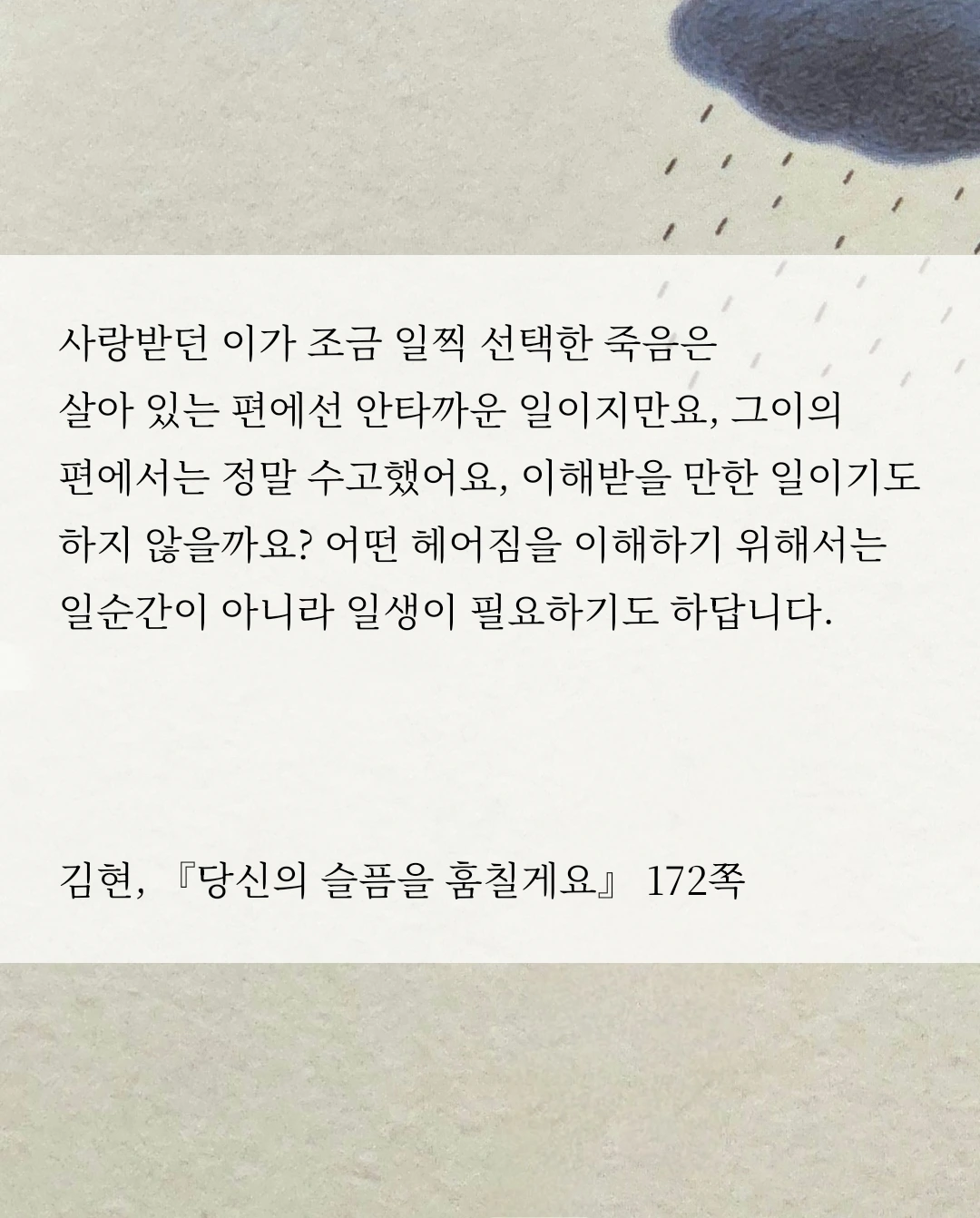 사랑받던 이가 조금 일찍 선택한 죽음은 살아 있는 편에선 안타까운 일이지만요, 그이의 편에서는 정말 수고했어요, 이해받을 만한 일이기도 하지 않을까요? 어떤 헤어짐을 이해하기 위해서는 일순간이 아니라 일생이 필요하기도 하답니다. (p. 172)