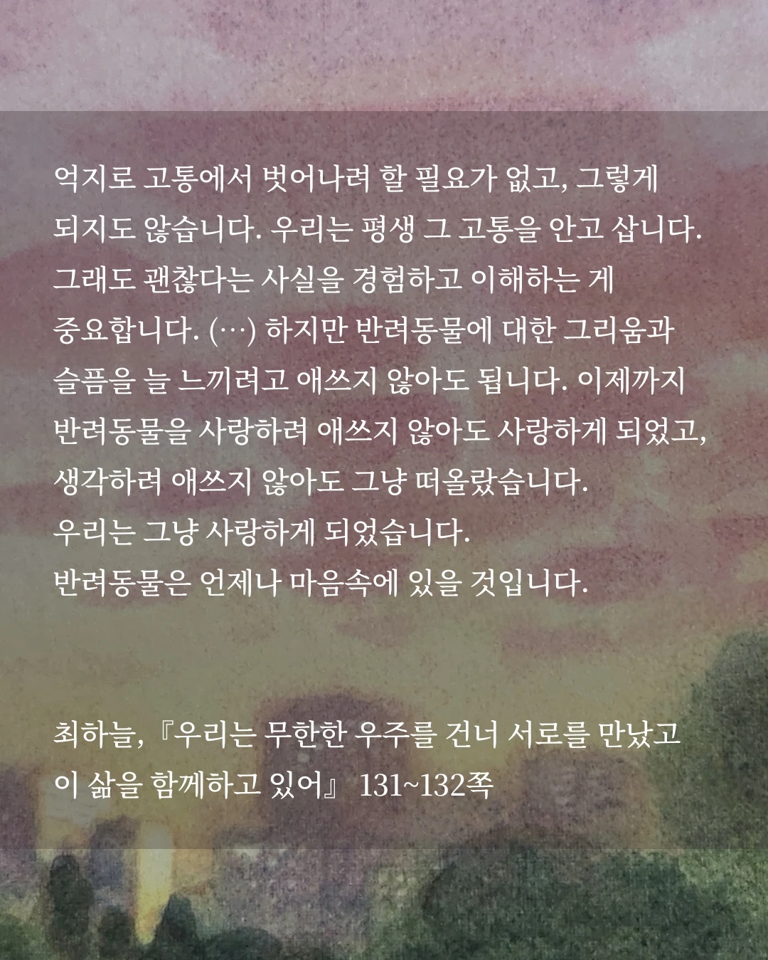 억지로 고통에서 벗어나려 할 필요가 없고, 그렇게 되지도 않습니다. 우리는 평생 그 고통을 안고 삽니다. 그래도 괜찮다는 사실을 경험하고 이해하는 게 중요합니다. (…) 하지만 반려동물에 대한 그리움과 슬픔을 늘 느끼려고 애쓰지 않아도 됩니다. 이제까지 반려동물을 사랑하려 애쓰지 않아도 사랑하게 되었고, 생각하려 애쓰지 않아도 그냥 떠올랐습니다. 우리는 그냥 사랑하게 되었습니다. 반려동물은 언제나 마음속에 있을 것입니다. (pp. 131~132)