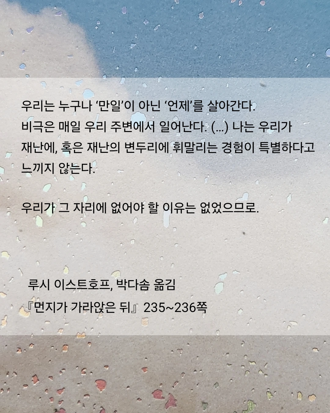 우리는 누구나 ‘만일’이 아닌 ‘언제’를 살아간다. 비극은 매일 우리 주변에서 일어난다. (…) 나는 우리가 재난에, 혹은 재난의 변두리에 휘말리는 경험이 특별하다고 느끼지 않는다.