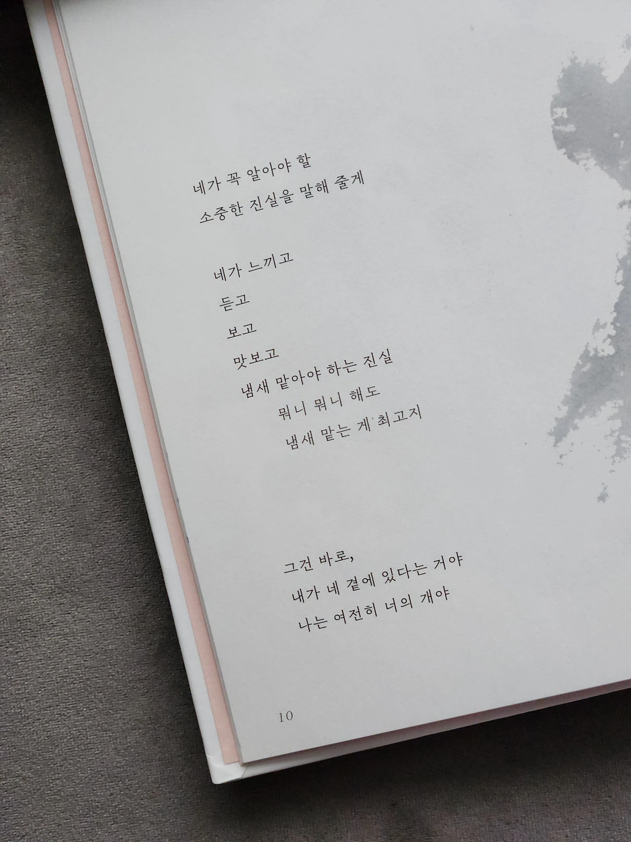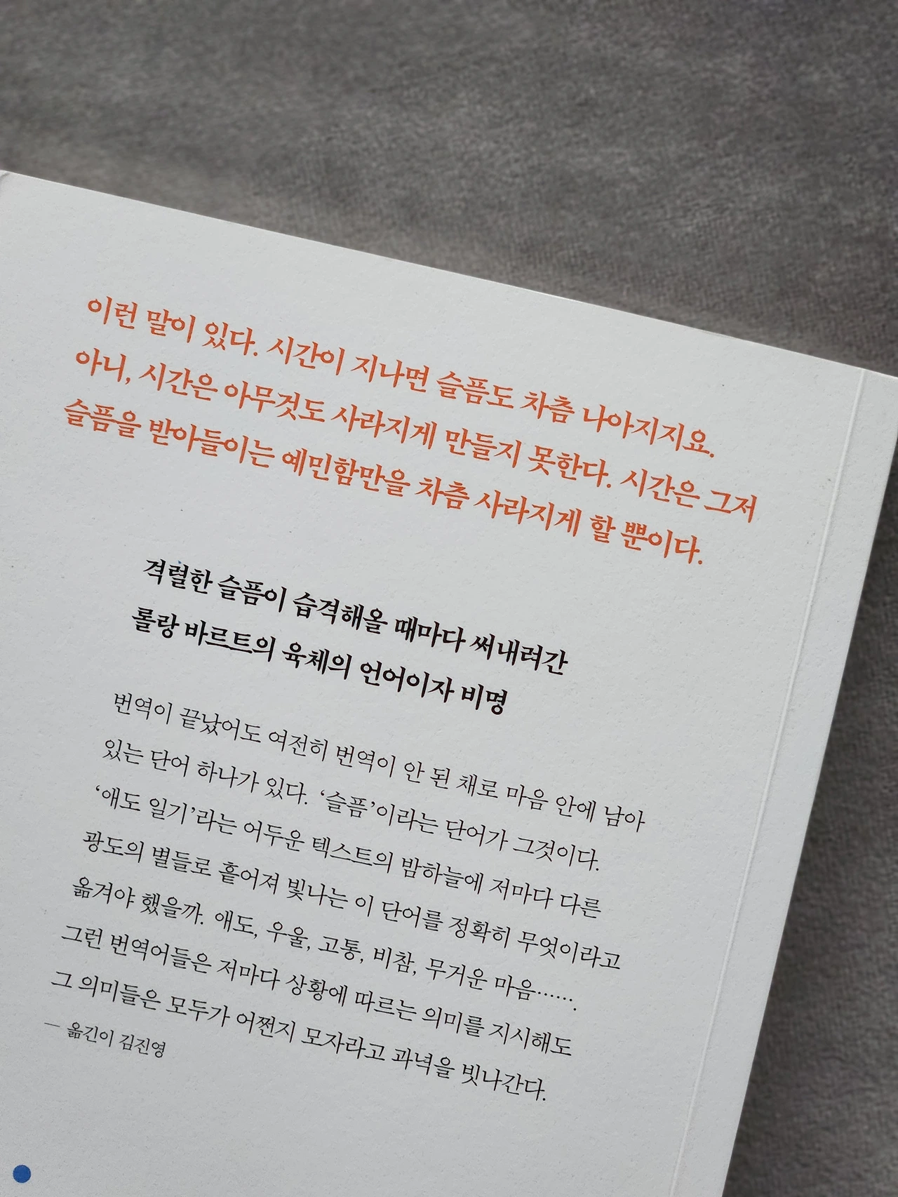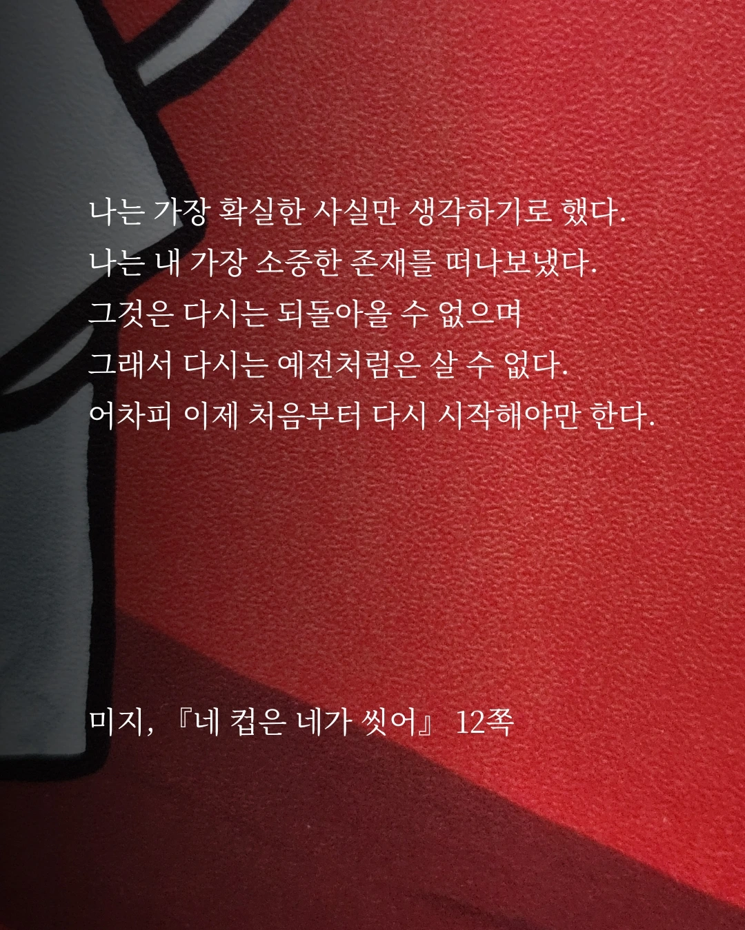 나는 가장 확실한 사실만 생각하기로 했다. 나는 내 가장 소중한 존재를 떠나보냈다. 그것은 다시는 되돌아올 수 없으며 그래서 다시는 예전처럼은 살 수 없다. 어차피 이제 처음부터 다시 시작해야만 한다. (p. 12)