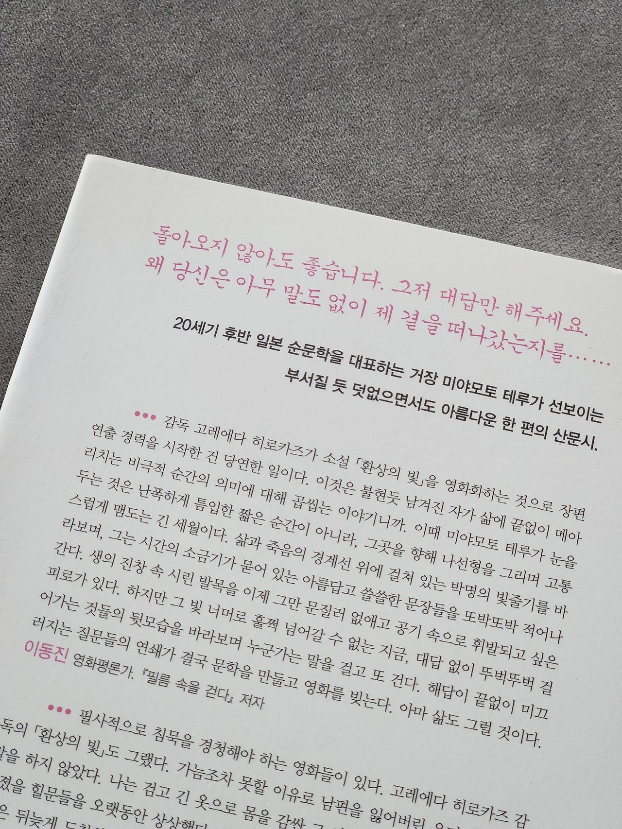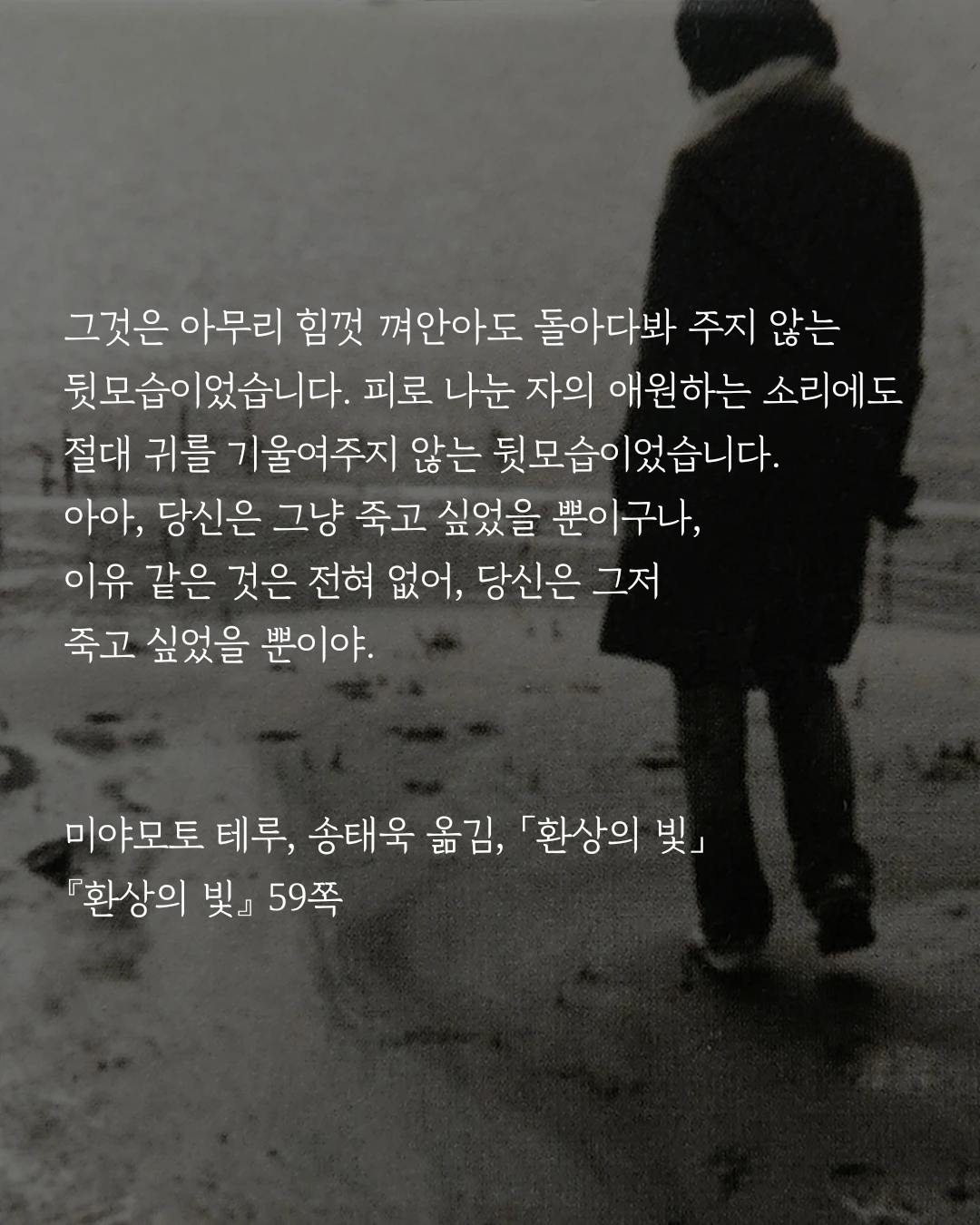 그것은 아무리 힘껏 껴안아도 돌아다봐 주지 않는 뒷모습이었습니다. 피로 나눈 자의 애원하는 소리에도 절대 귀를 기울여주지 않는 뒷모습이었습니다. 아아, 당신은 그냥 죽고 싶었을 뿐이구나, 이유 같은 것은 전혀 없어, 당신은 그저 죽고 싶었을 뿐이야. (p. 59)