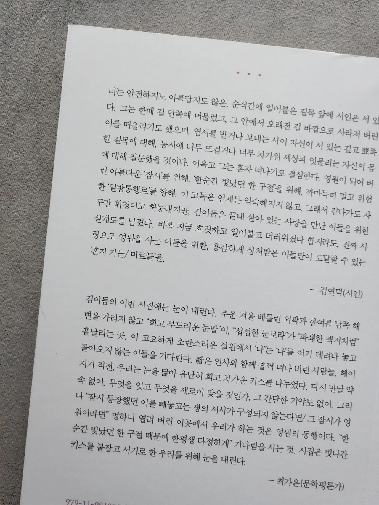불가해한 생의 미로를 혼자 걷는 필멸자의 마음에 눈가루처럼 날아와 박힌 사랑의 파편들.