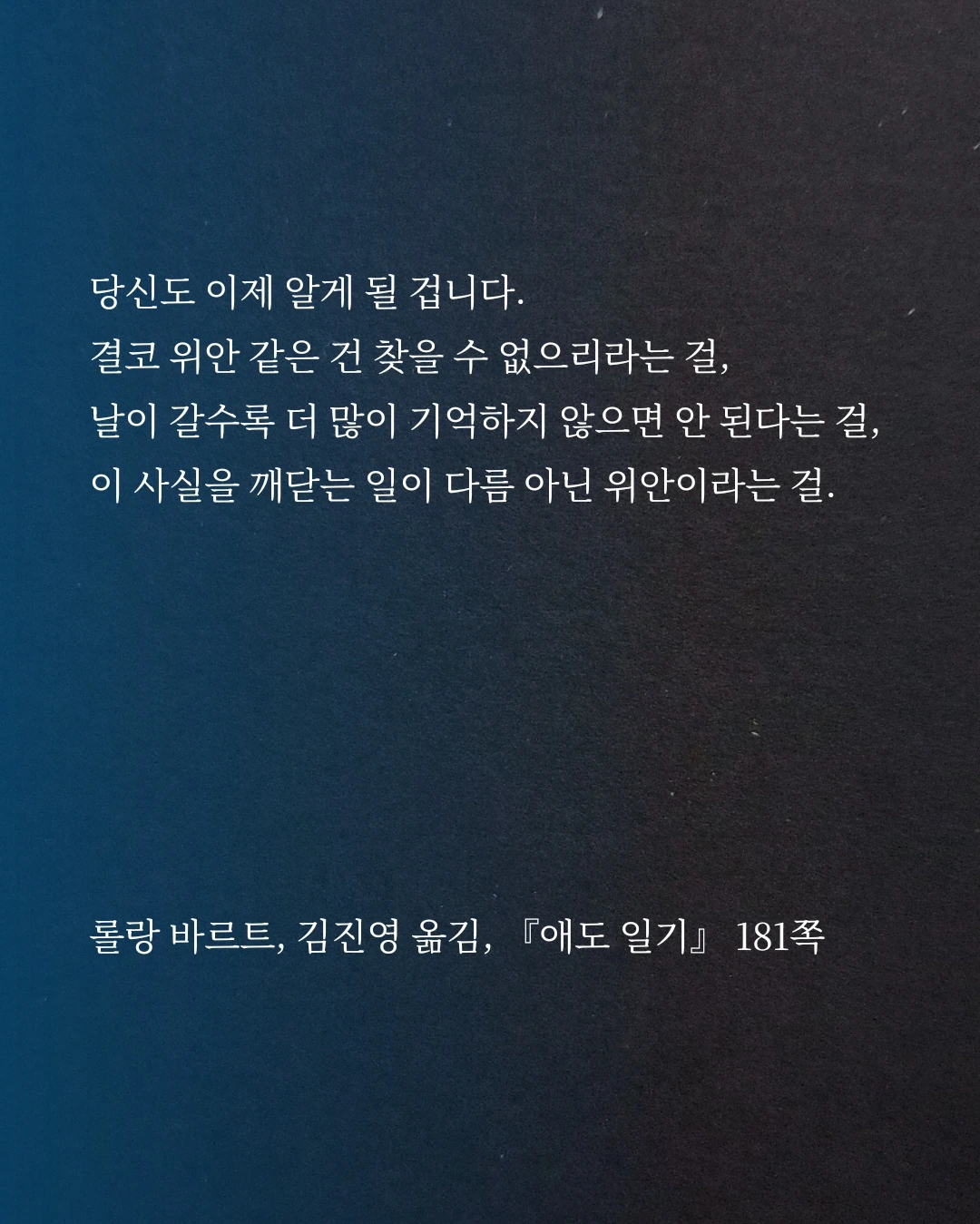 당신도 이제 알게 될 겁니다. 결코 위안 같은 건 찾을 수 없으리라는 걸, 날이 갈수록 더 많이 기억하지 않으면 안 된다는 걸, 이 사실을 깨닫는 일이 다름 아닌 위안이라는 걸. (p. 181)