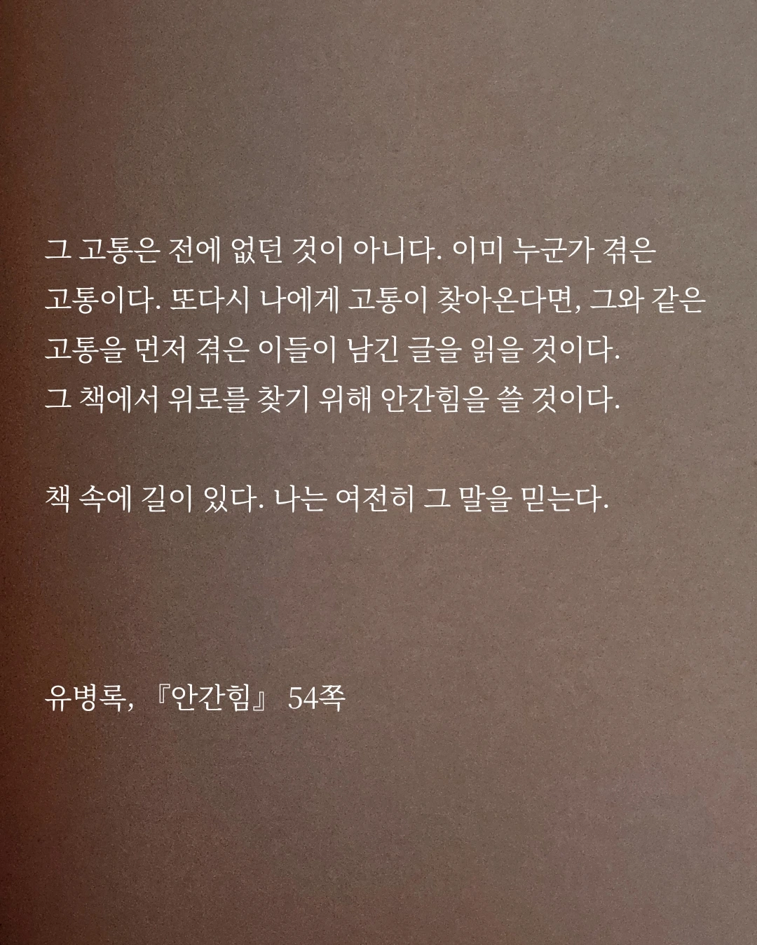 그 고통은 전에 없던 것이 아니다. 이미 누군가 겪은 고통이다. 또다시 나에게 고통이 찾아온다면, 그와 같은 고통을 먼저 겪은 이들이 남긴 글을 읽을 것이다. 그 책에서 위로를 찾기 위해 안간힘을 쓸 것이다. 책 속에 길이 있다. 나는 여전히 그 말을 믿는다. (p. 54)