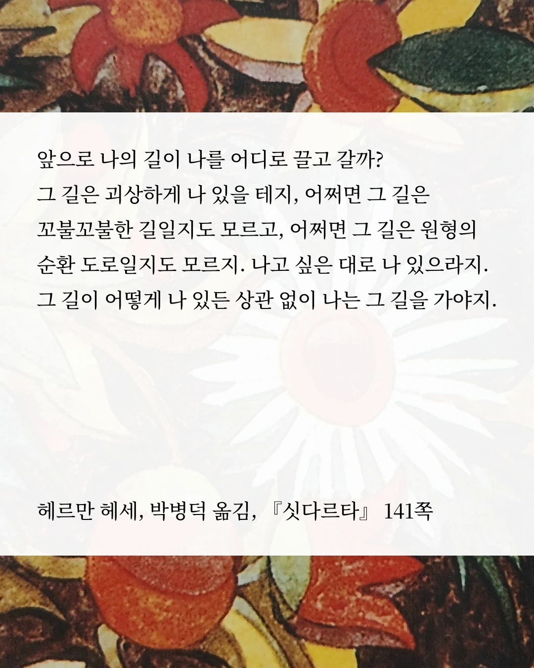 앞으로 나의 길이 나를 어디로 끌고 갈까? 그 길은 괴상하게 나 있을 테지, 어쩌면 그 길은 꼬불꼬불한 길일지도 모르고, 어쩌면 그 길은 원형의 순환 도로일지도 모르지. 나고 싶은 대로 나 있으라지. 그 길이 어떻게 나 있든 상관 없이 나는 그 길을 가야지. (p. 141)