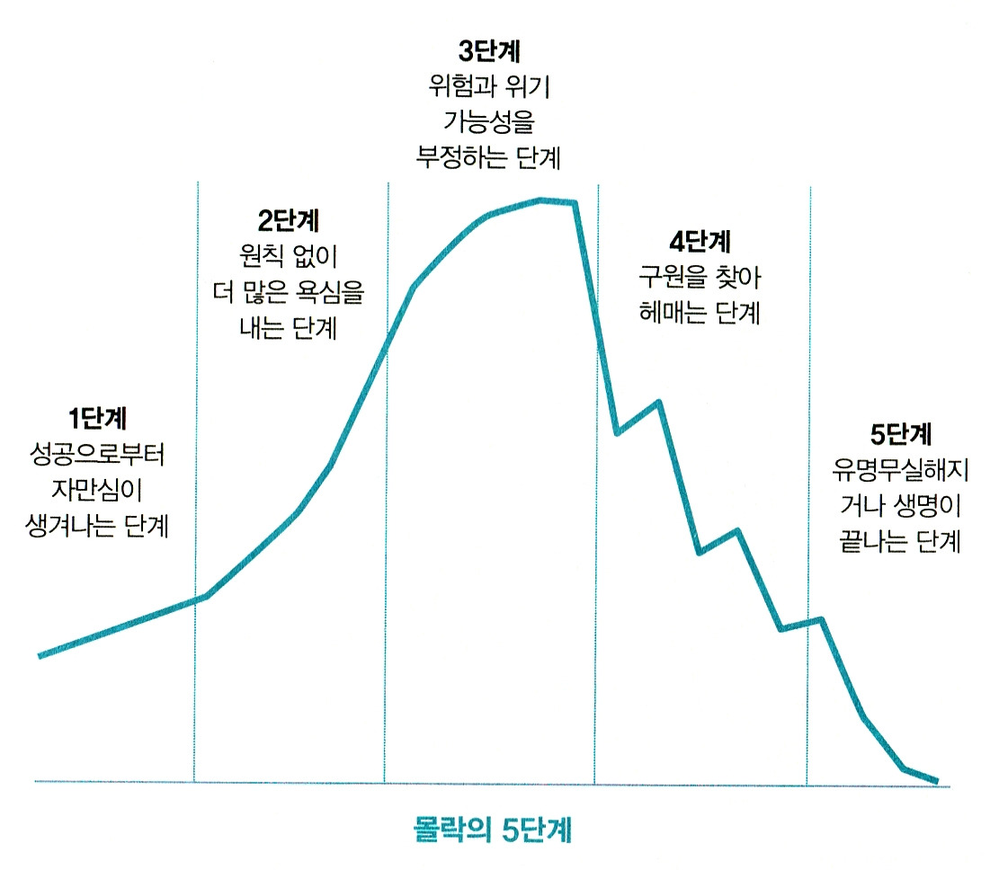 짐 콜린스는 <위대한 기업은 다 어디로 갔을까>에서 위대한 기업도 몰락할 수 있으며 몰락은 크게 5단계를 거친다고 주장합니다.