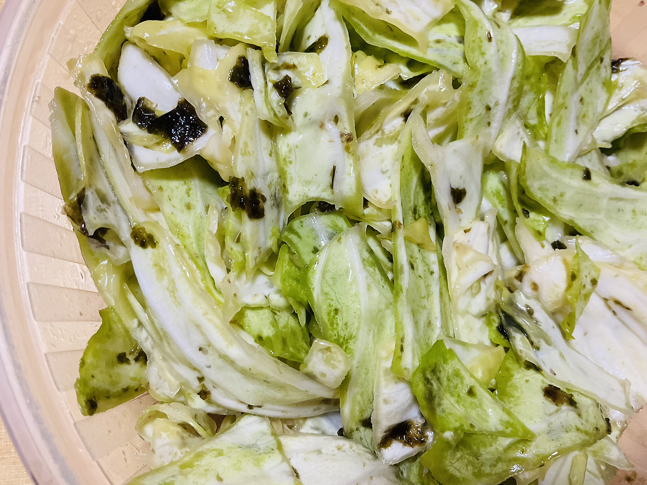 냉장고를 열어보니 김이 군데군데 묻은 양배추 샐러드가 있다. 맛을 보니 담백하고 고소하다.