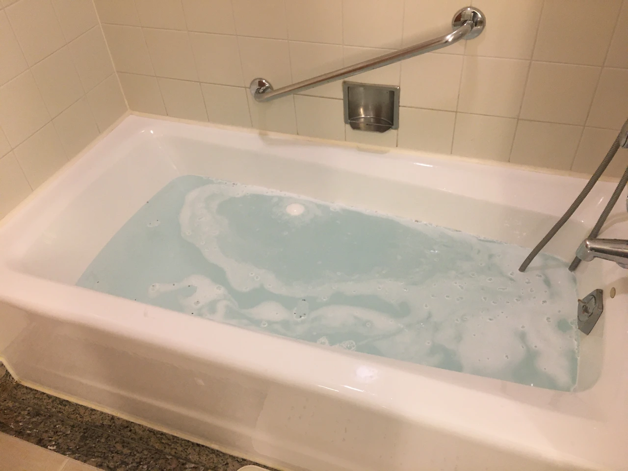 “욕조에 들어갔다가 나와서 샤워부스에 가서 샤워해. 호텔 가운을 입고 나와.”
