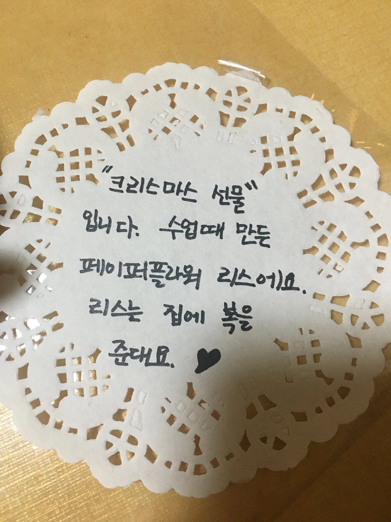 12월이 되니 선생님 블로그에 강의하신 글들이 올라온다. 이렇게 바쁘시면 내 약속은 잊고 말겠지.. 하고 내심 그러고 있었다. 그런데, 크리스마스이브 전날 카톡이 왔다. 약속한 키트를 보내주셨다고. 약속을 잊지 않은 것도 고마운데, 집에 도착한 택배를 보니 선생님께서 직접 만드신 리스까지 있었다. 집의 복을 준다는 덕담과 함께. 엄마는 리스를 보시곤 자리를 잡아 신중히 걸으셨다. 복이 신중히 우리 집에 오길 바라셨나 보다.