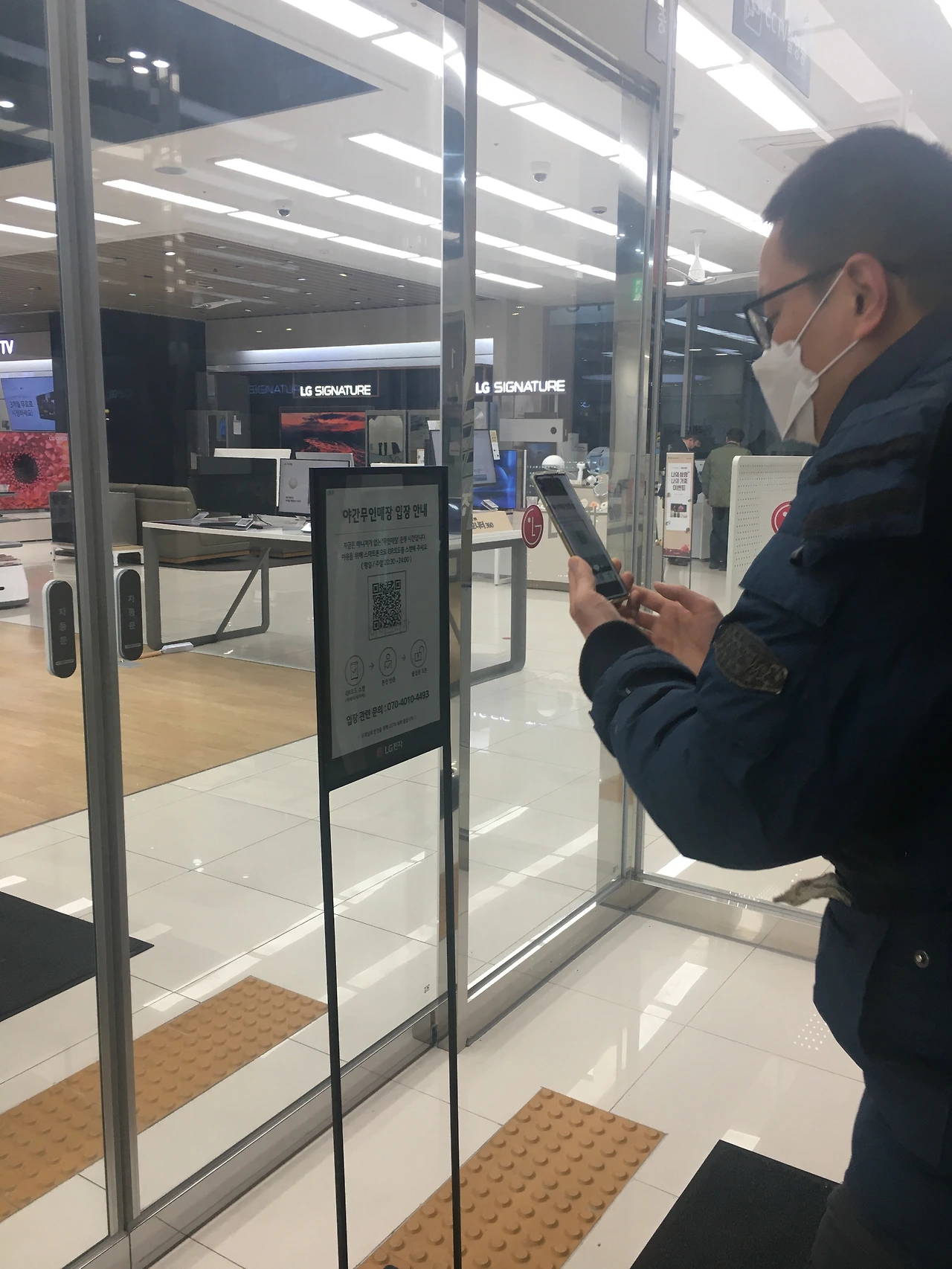 그러다보니 어느덧 매장 앞이다. 8:30이 되었는데 투명유리 안에 직원들이 있다. 잠시 기다리다 동생이 입구에 섰다. qr코드로 본인인증 홈페이지 접속해 인증하니 매장 문이 열린다. 신기하다.