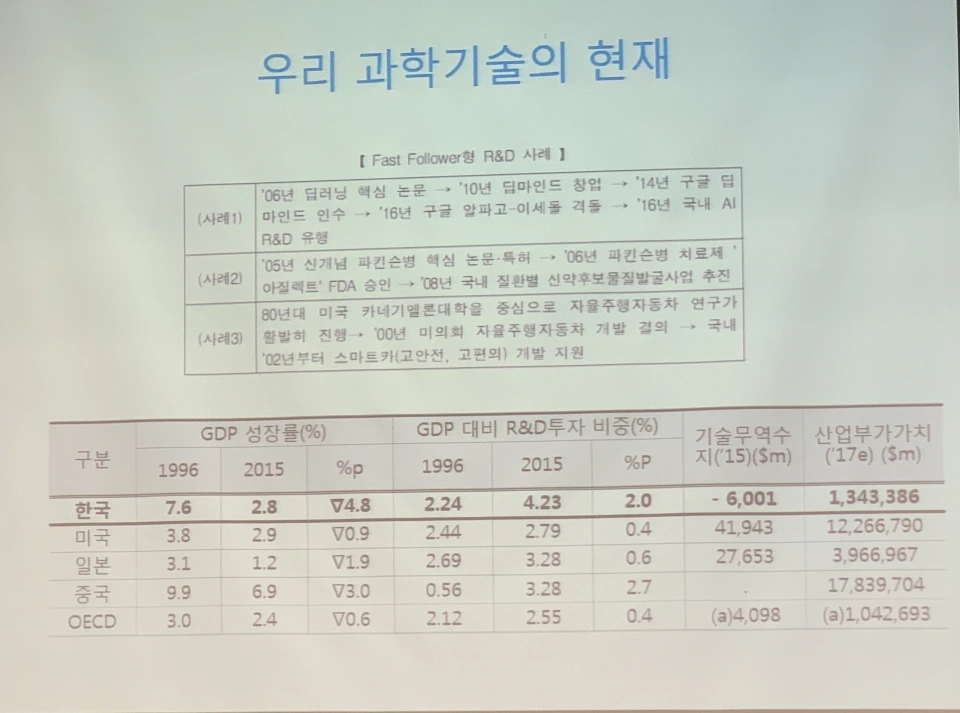 한국은 GDP 대비 R&B 투자 비중이 2015년 기준 4.23%로 미국, 일본, 중국보다 압도적으로 높았다. 그러나 지적재산권을 포함한 기술무역수지는 -6,001($m)으로 OECD 국가 중 압도적으로 낮았다. 미국 일본 등은 미래를 내다보며 소프트웨어 개발과 여러 원천기술 개발에 상당한 공을 들인다. 반면 한국은 돈은 많이 투자하지만 그저 단기 성과 위주의 연구에 그친다. 이런 현상을 해결하기 위해서는 '아이디어는 곧 지적재산'이라는 학습 경험을 제공하는 교육정책이 필요하다는 주장이다.