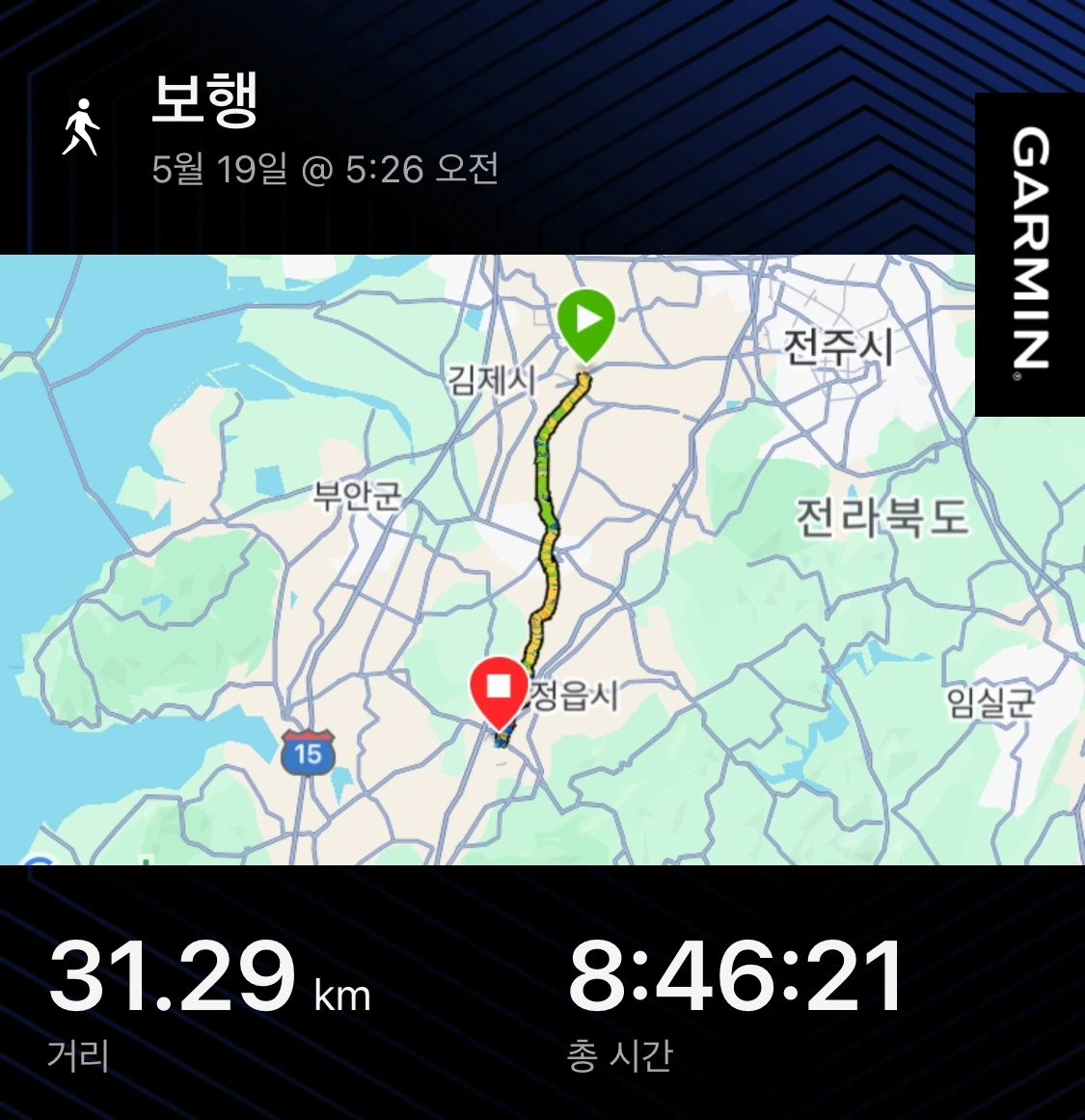 이동경로: 전북 김제시 세븐 모텔 - 전북 정읍시 정읍역(정읍 골드스테이 모텔)