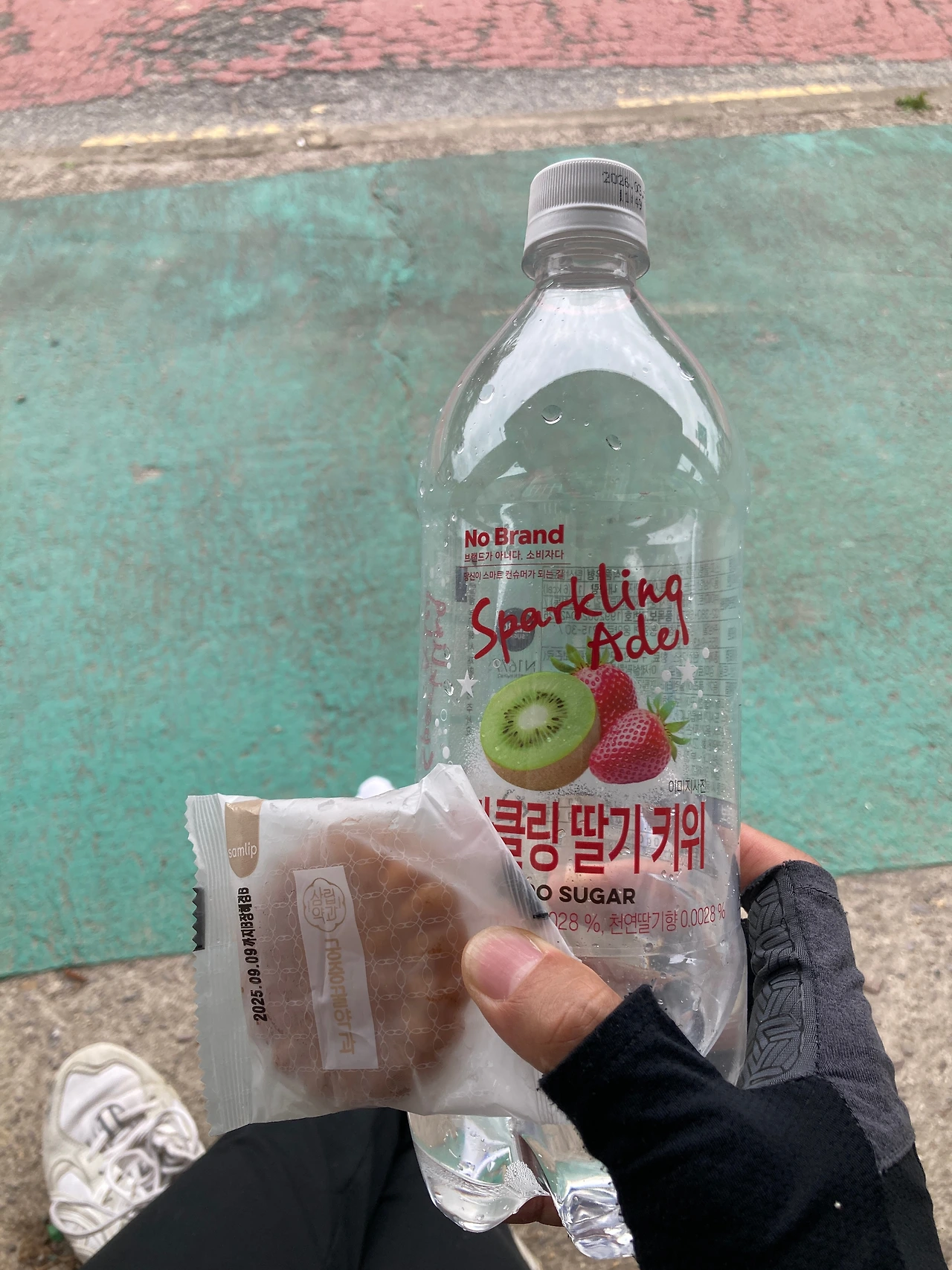50분도 채 지나지 않아서 버스 정류장에 철퍼덕 앉아 탄산수와 카페에서 응원 선물 받은 약과를 먹었다.