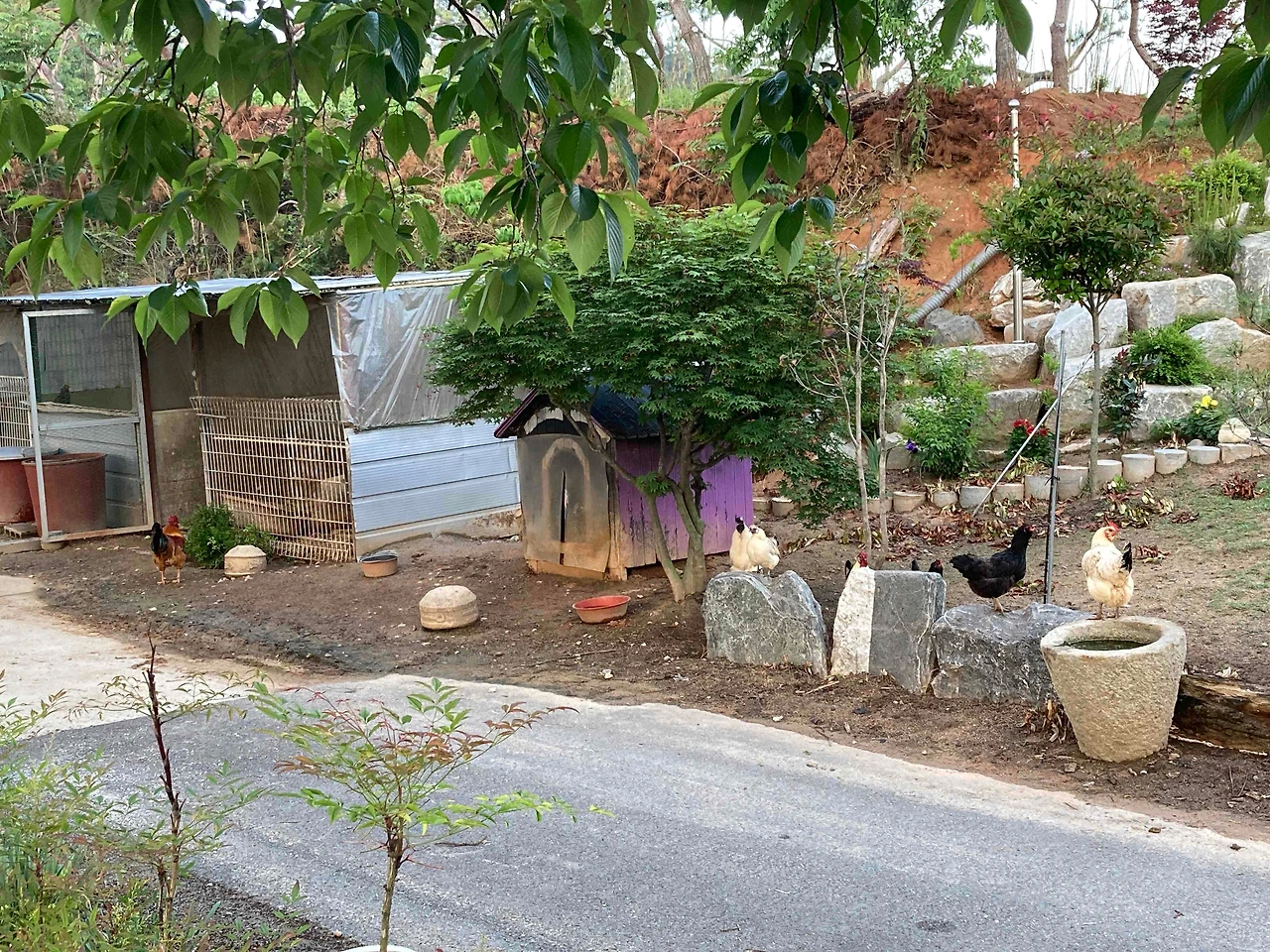 보통은 닭을 우리 안에 가둬 놓고 키우는데 닭들이 전부 나와있다.