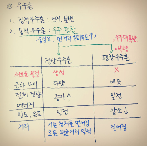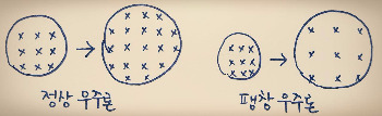 팽창 우주론은 우리가 많이 들어본 빅뱅 이론, 우주 대폭발 이론과 같은 말입니다. 한 점에 모여있던 모든 에너지와 질량이 한 순간에 폭발하며 우주가 탄생했다는 이론입니다. 새로운 물질이 생성되지 않으며 우주가 팽창하기 때문에 우주의 전체 질량과 에너지는 일정하고 밀도와 온도는 점점 감소한다는 이론입니다. 대표적인 학자로는 프리드만과 조지 가모프가 있습니다.