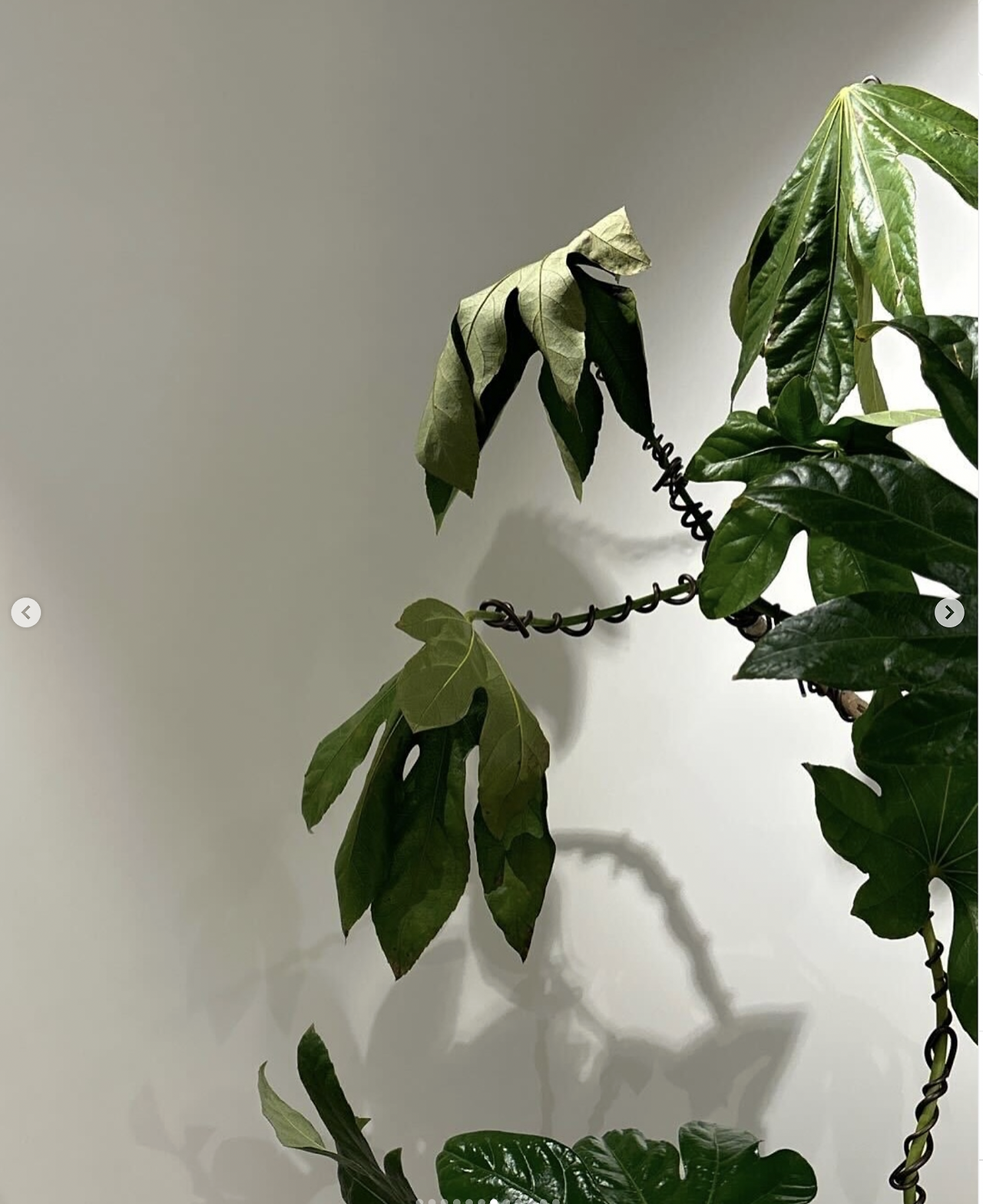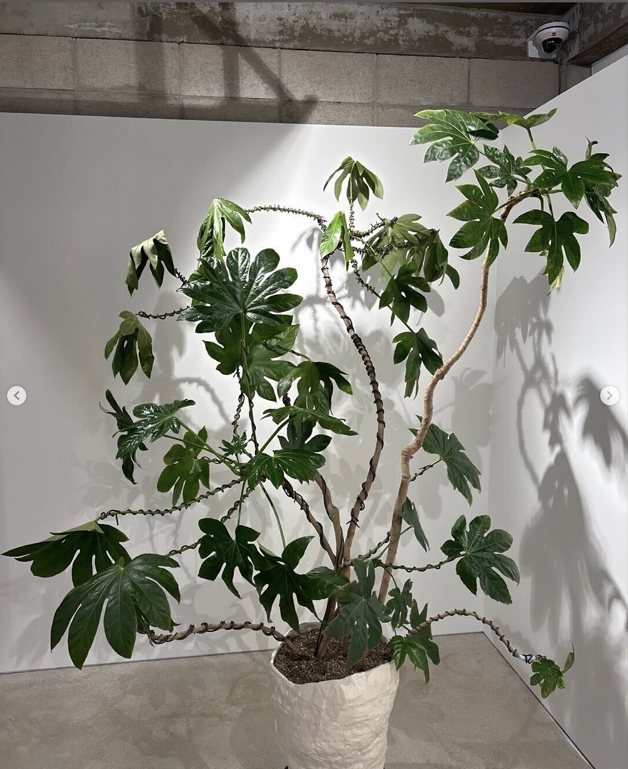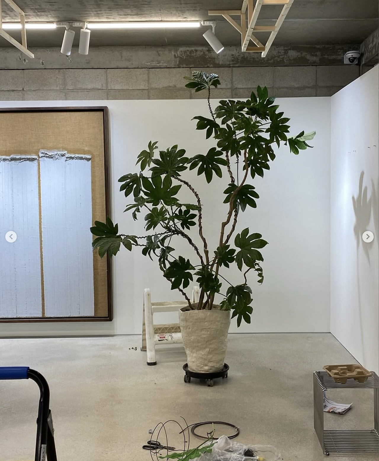 현장 작업은 늘 예상과 빗나간다.거칠었던 잎을 정리하고 분재용 철사를 이용해 형태를 잡은 팔손이는 전시가 시작되고 2주가 채 지나지 않은 시점부터 기존 잎들을 눕히기 시작했다. 땅에 박힌 두툼한 뿌리들을 뽑아냈으니, 새롭게 안착한 tfp의 백색 도자기에 제대로 자리잡겠다고, 선언한 셈이었다.