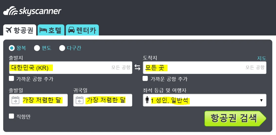 항공권검색엔진 스카이스캐너(skyscanner.co.kr)는 지금있는 곳에서 갈 수 있는 '모든 곳' 목적지의 검색을 제공한다. 출발지에는 당신이 출발하는 곳, 도착지는 '모든 곳' 또는 'Everywhere' 로 출발일에는 출발을 원하는 정확한 날짜부터 월별 검색, 또는 가장 저렴한 달로 검색이 가능하다. 스카이스캐너에게 목적지 결정을 맡겨보는 것도 하나의 방법!