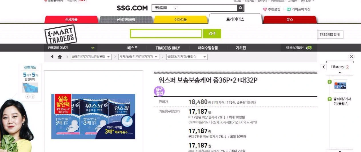 * 한국 이마트 트레이더스 위스퍼 (Always) 프로모션 팩 (중 72p, 대 32p): 그냥 사면 개당 178원, 카드 할인으로 사면 개당 165원